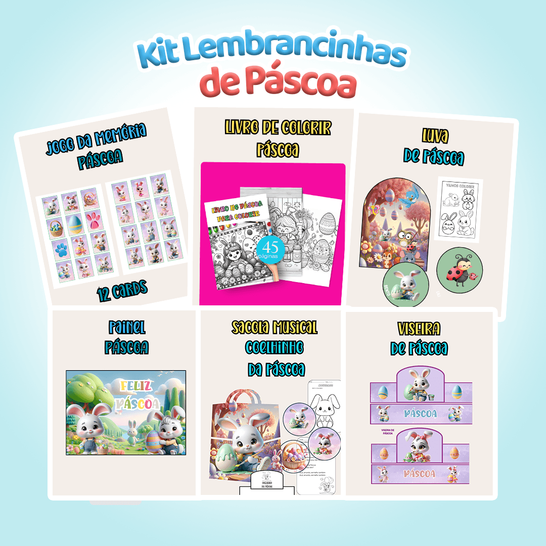 Combo de Páscoa com atividades educativas e lúdicas para Educação Infantil. Inclui jogo da memória, livro de colorir, painel, luva interativa, viseira e sacola musical. Material em PDF pronto para imprimir.