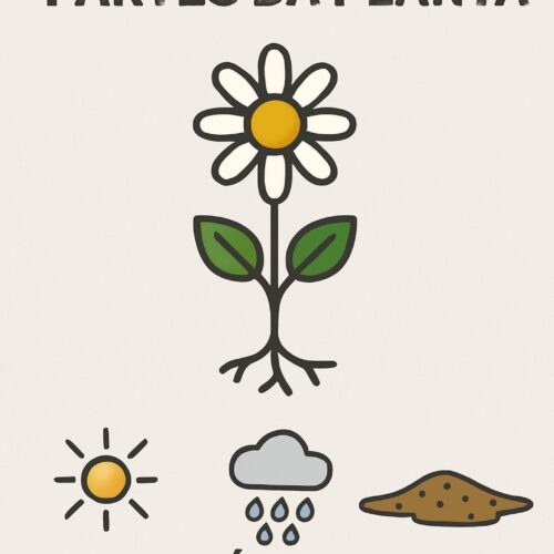 Material visual e interativo para o 1º ano do Ensino Fundamental. Os alunos identificam partes da planta (raiz, caule, folhas,...