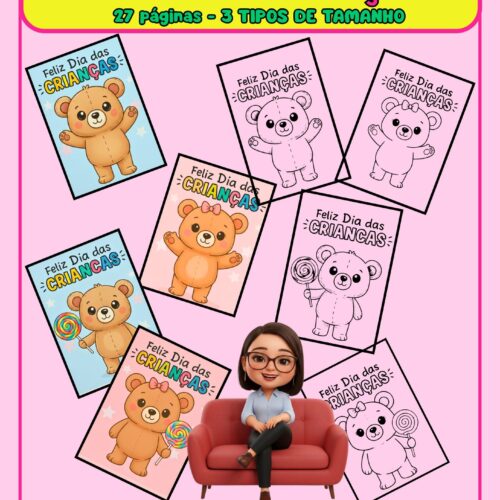 Arquivo digital Lembrancinha Dia das Crianças – cartões e atividades em versão colorida e para colorir. São 27 páginas em...