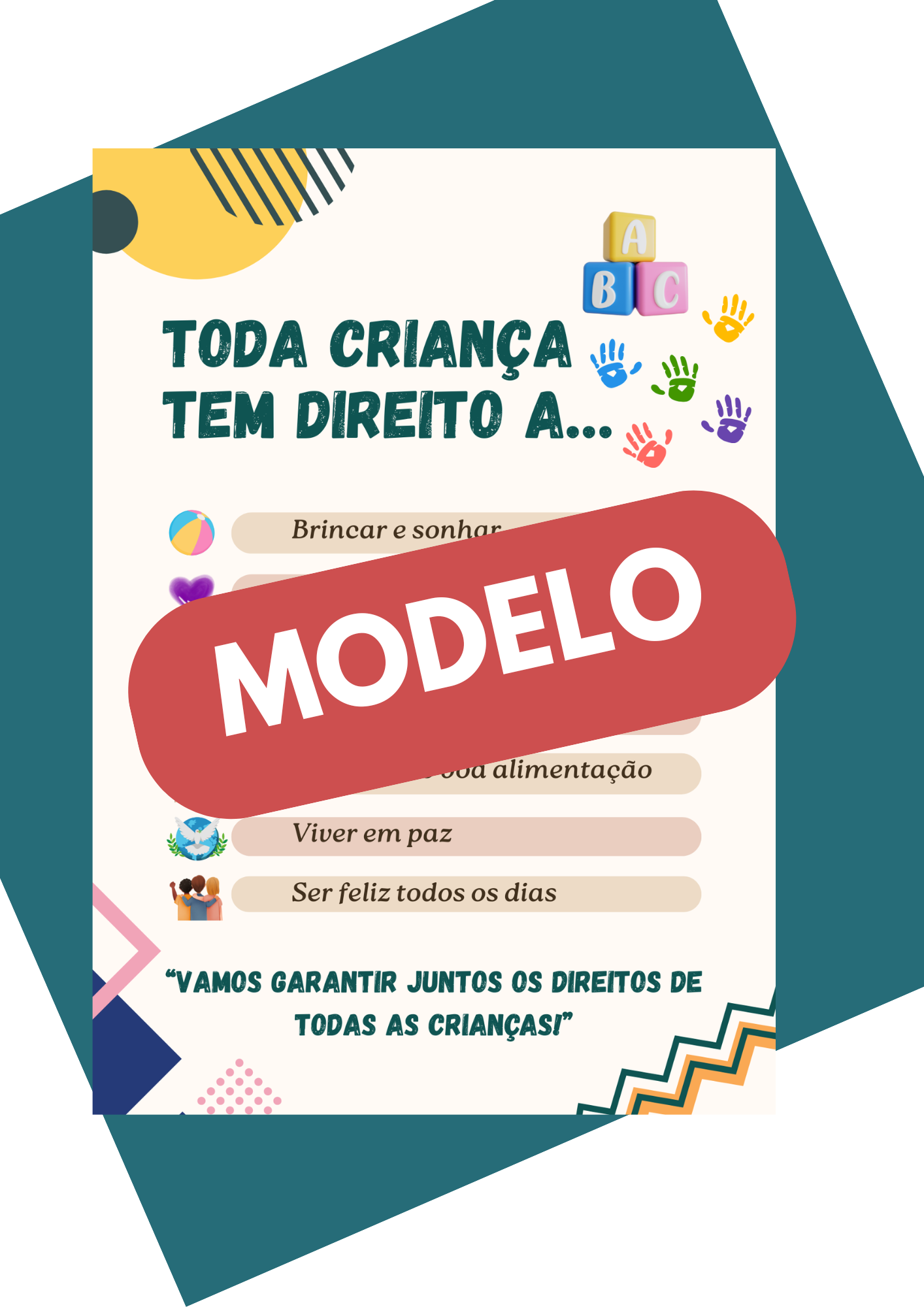 O Cartaz “Os Direitos das Crianças” foi criado para inspirar conversas significativas em sala de aula e reforçar valores essenciais, em qualquer época do ano. Apresenta, de forma clara e visualmente atraente, os principais direitos das crianças, estimulando o respeito, a empatia e a cidadania desde cedo.
