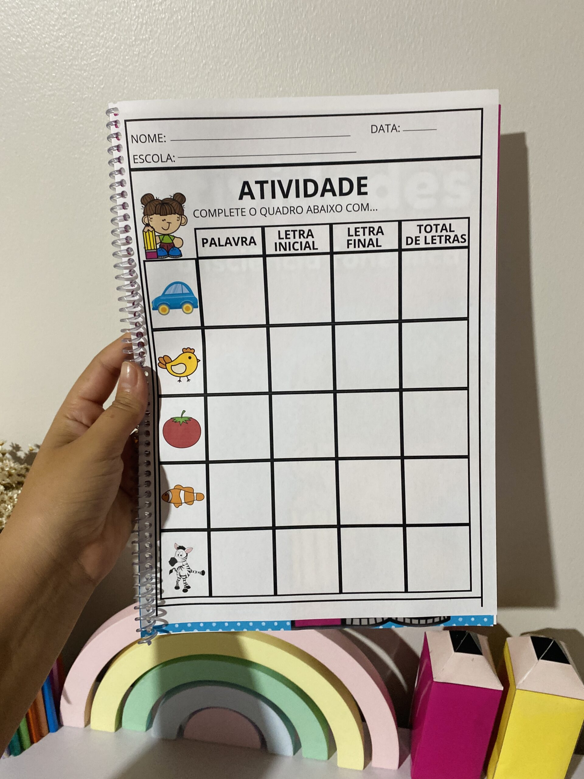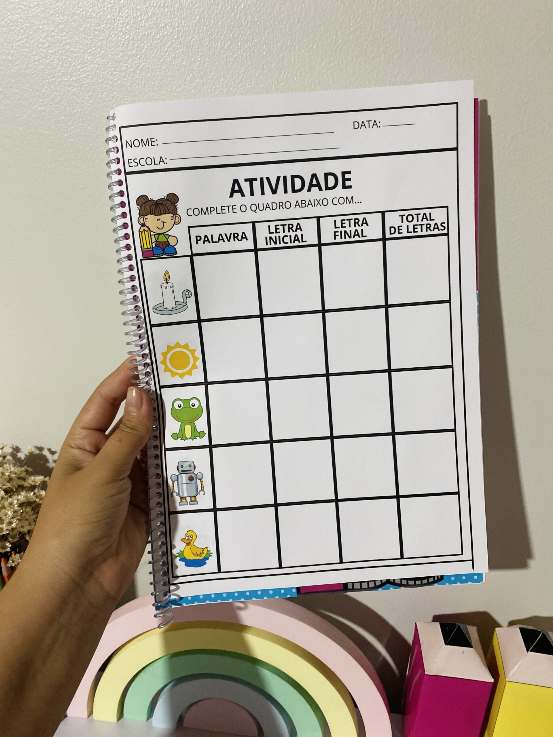 Material prático para trabalhar a identificação da letra inicial, letra final e a quantidade de letras em cada palavra.