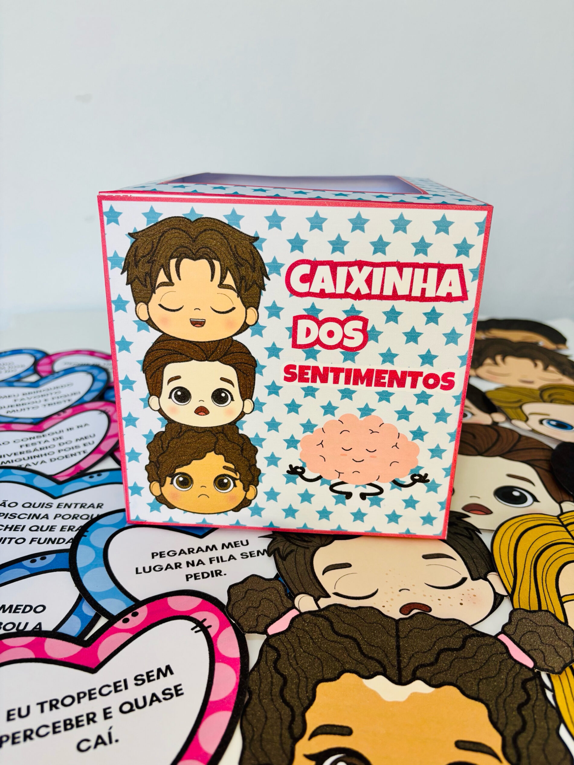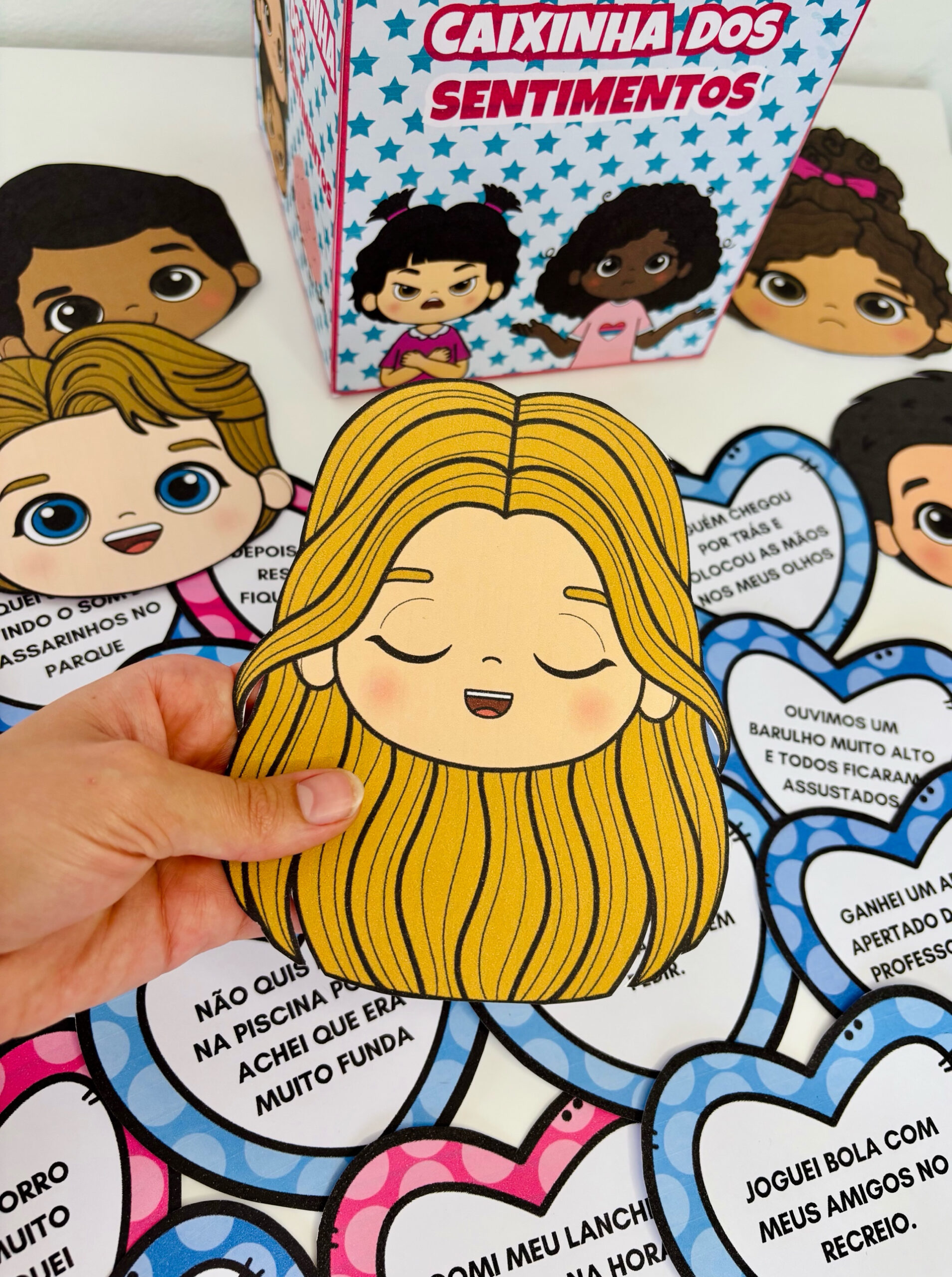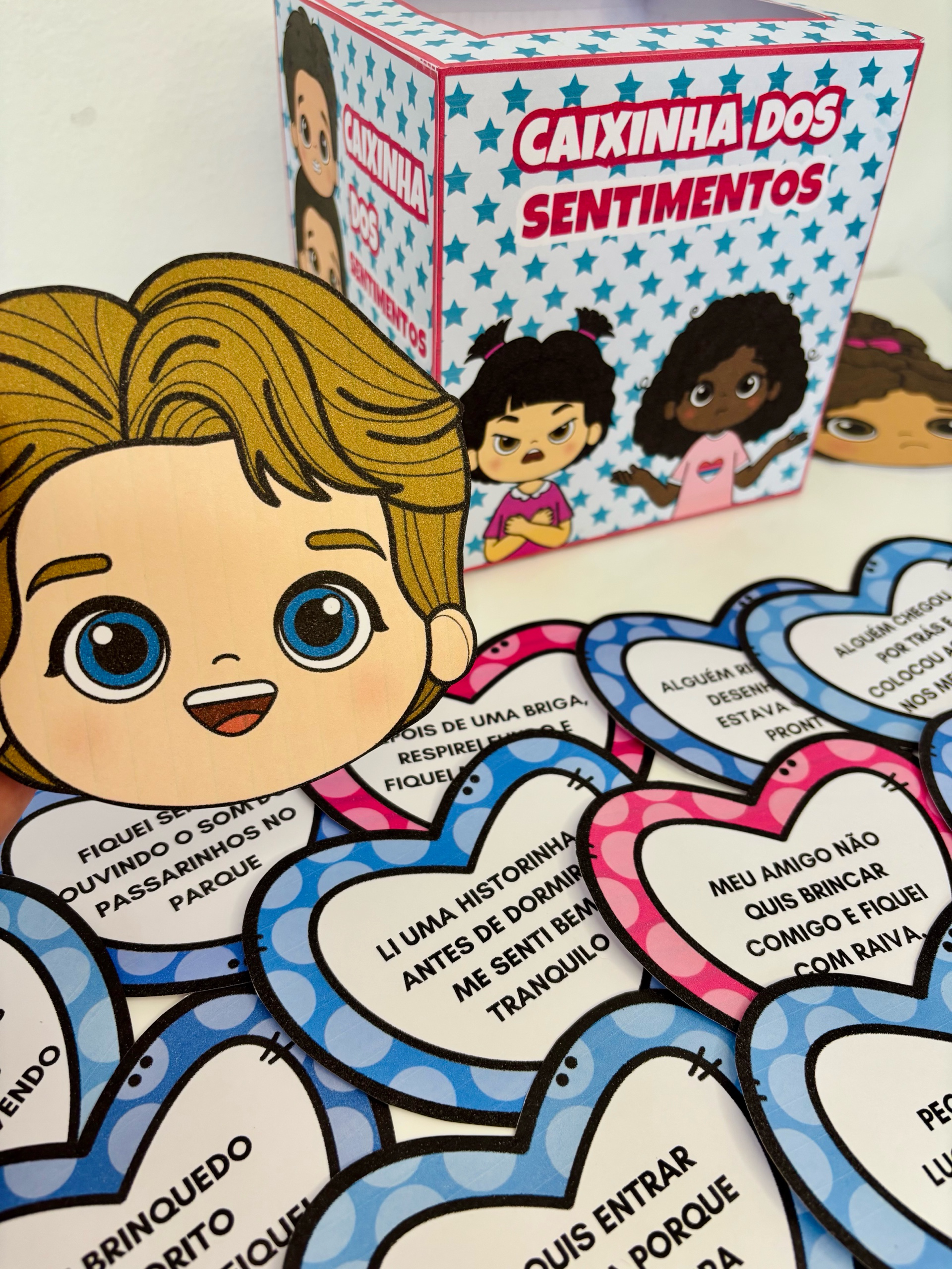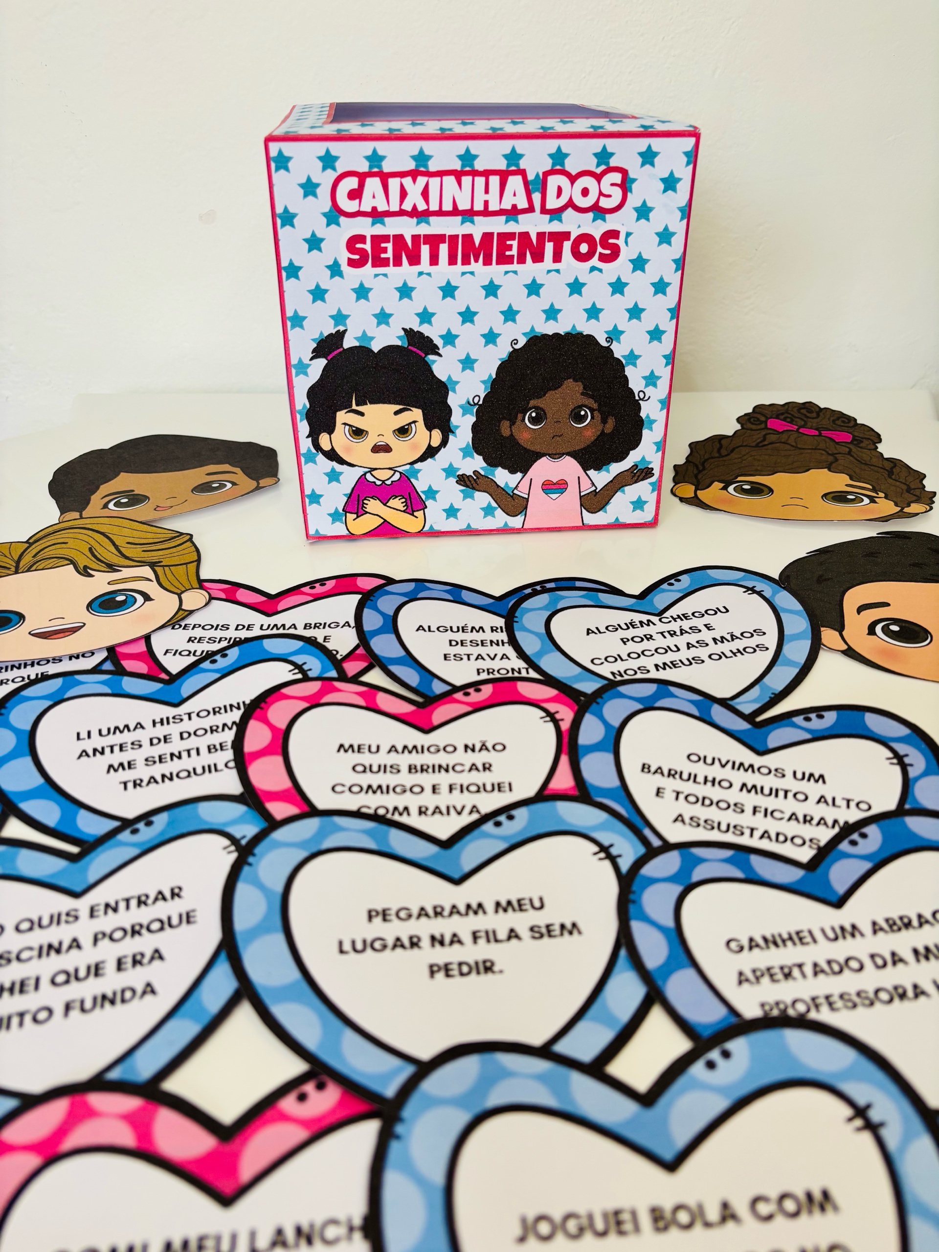 A Caixinha dos Sentimentos é um recurso pedagógico criativo e interativo, desenvolvido para ajudar as crianças a reconhecer, nomear e expressar suas emoções. A caixinha inclui diversas fichas com expressões faciais representando diferentes sentimentos, como felicidade, tristeza, raiva, medo e surpresa, e fichas de ações cotidianas que descrevem situações comuns no dia a dia das crianças.