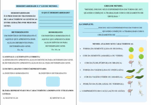 Neste arquivo você encontrará atividades adaptadas sobre a 1ª lei de Mendel e conceitos básicos sobre hereditariedade.