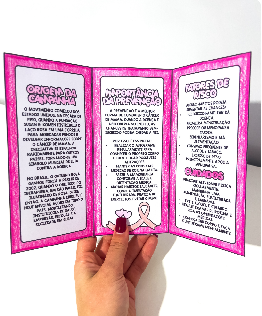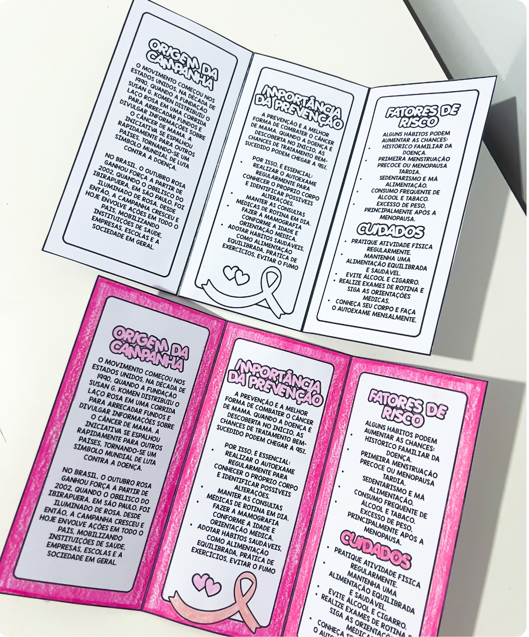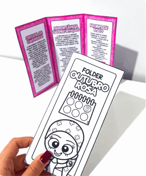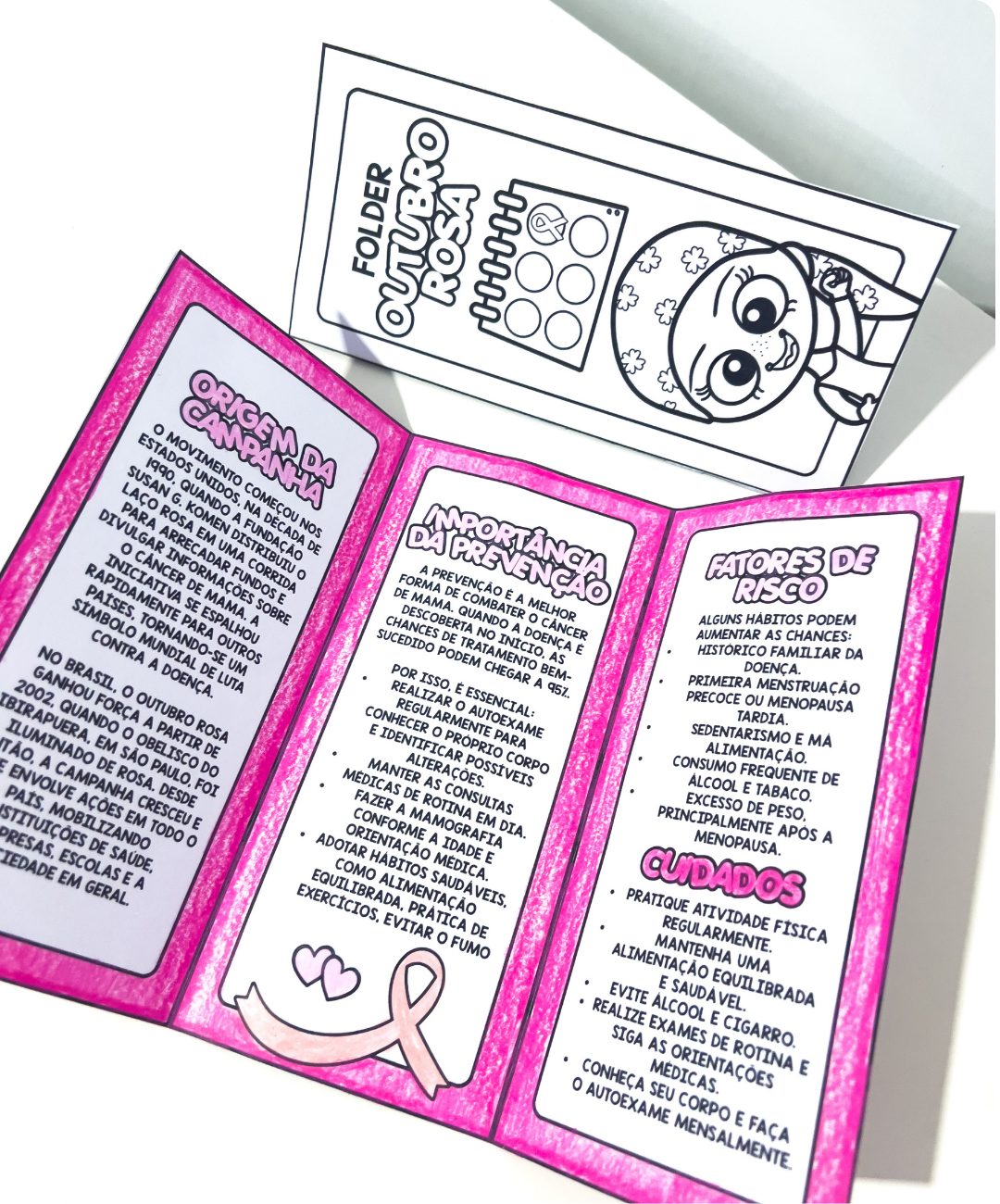 O folder informativo traz informações simples e adaptadas sobre o significado do Outubro Rosa, a importância do cuidado com a saúde e maneiras pelas quais as crianças podem participar desse movimento de carinho e apoio.