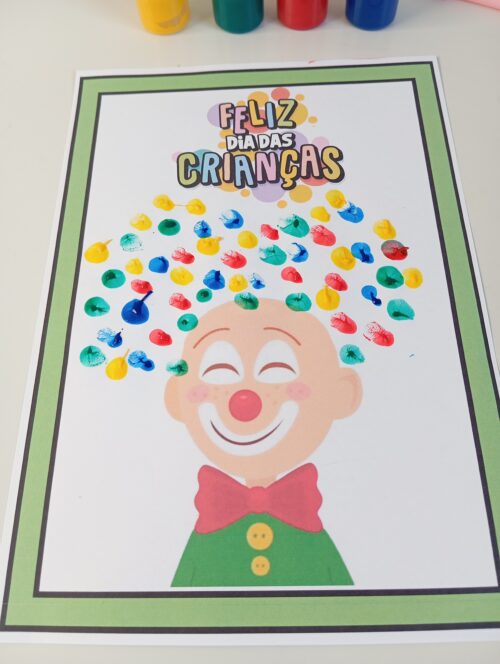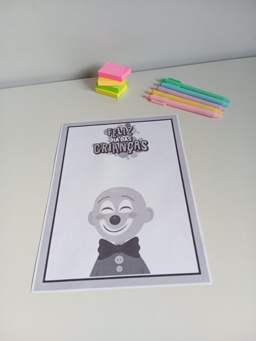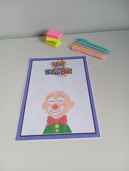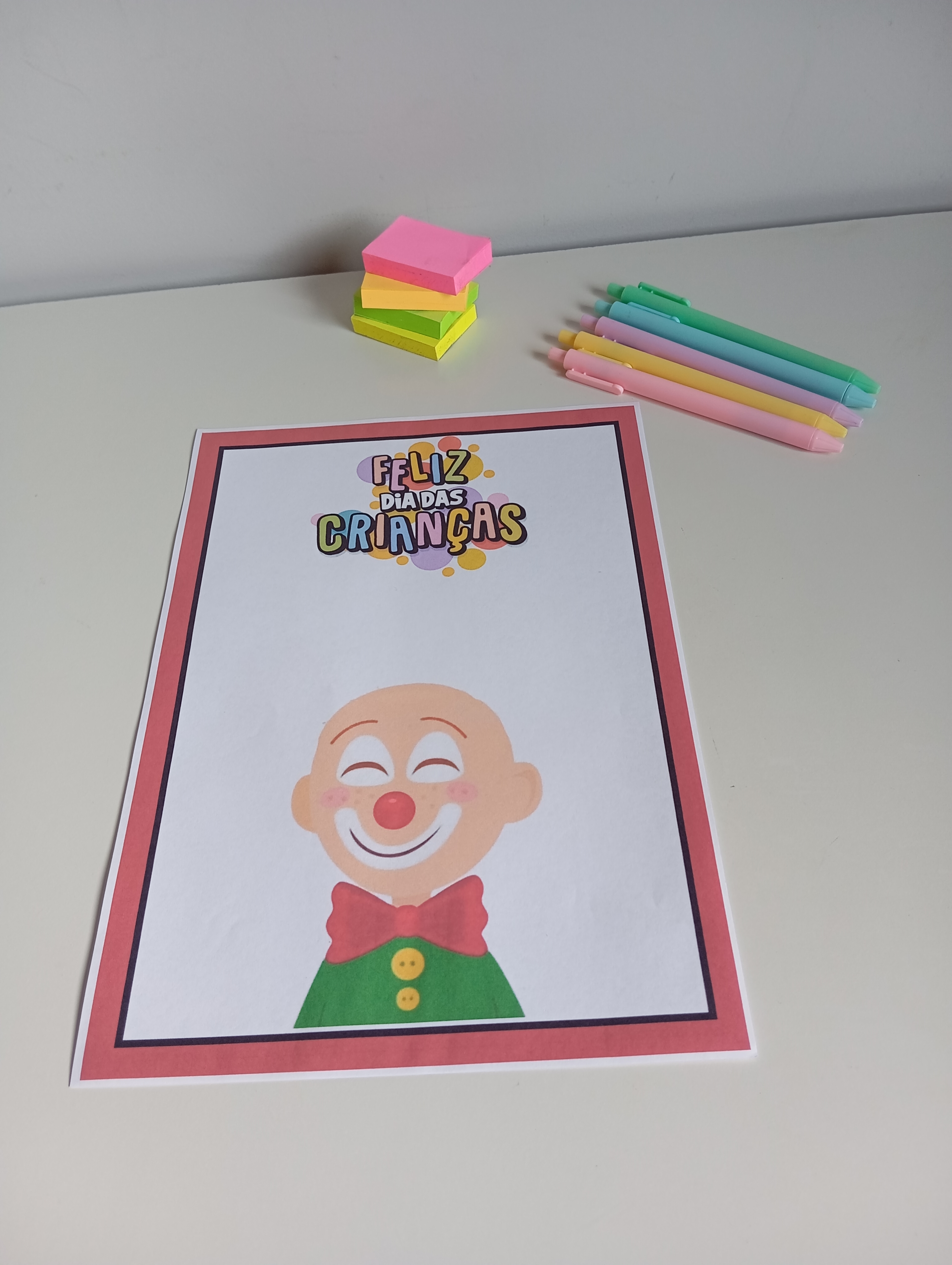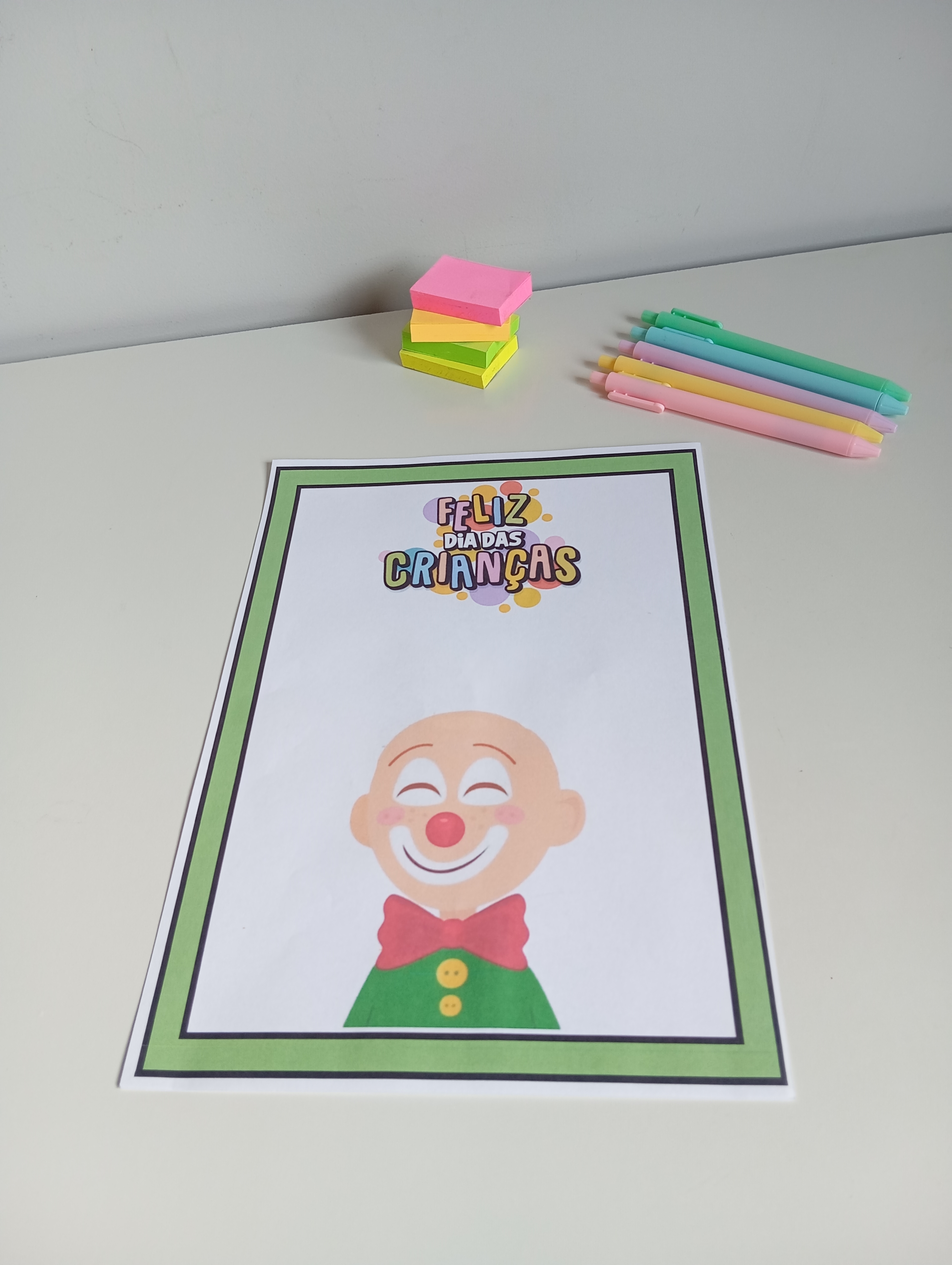 Quatro folhas A4 prontas para imprimir, onde as crianças podem colorir e criar penteados divertidos no cabelo do palhacinho.