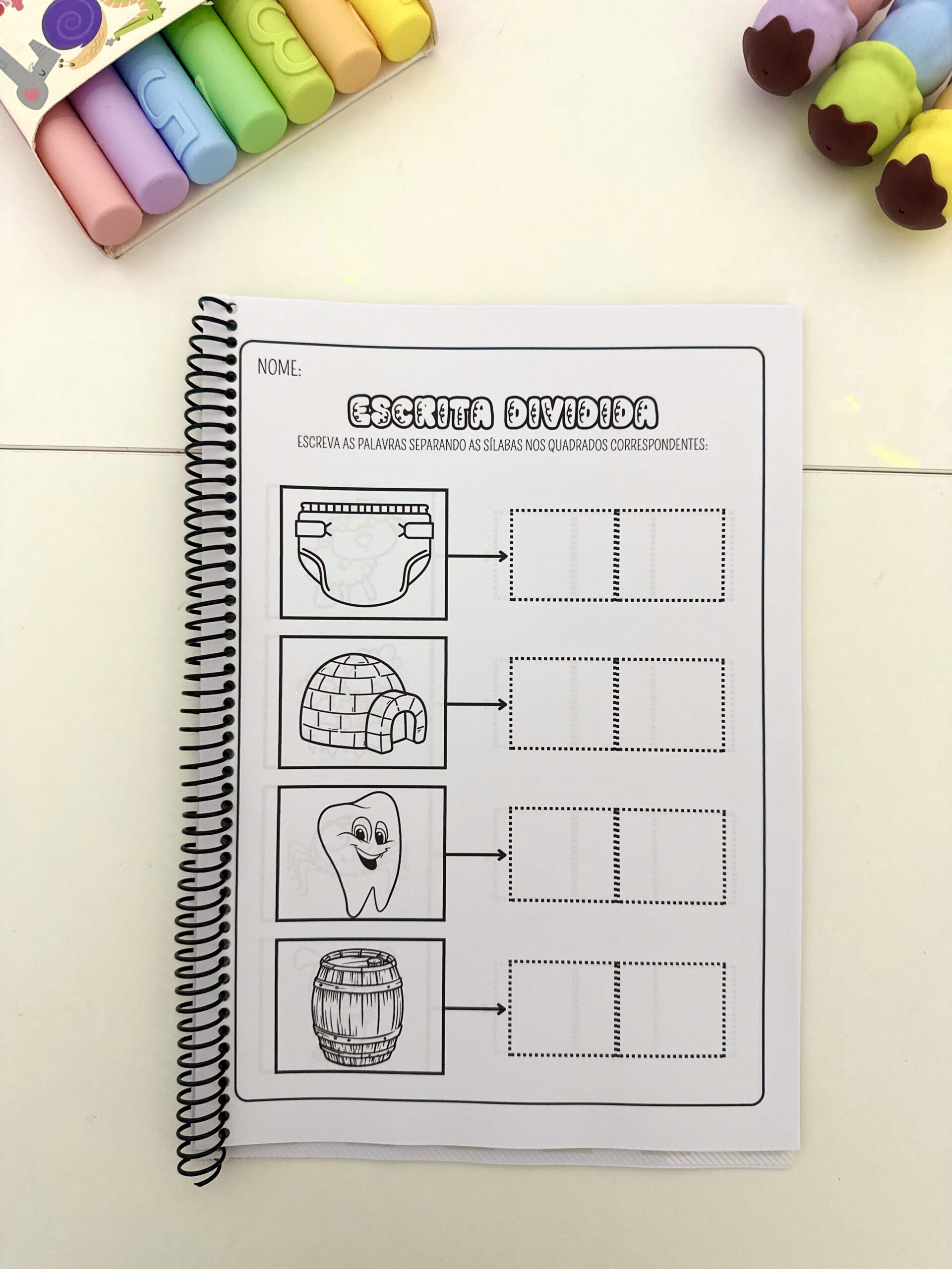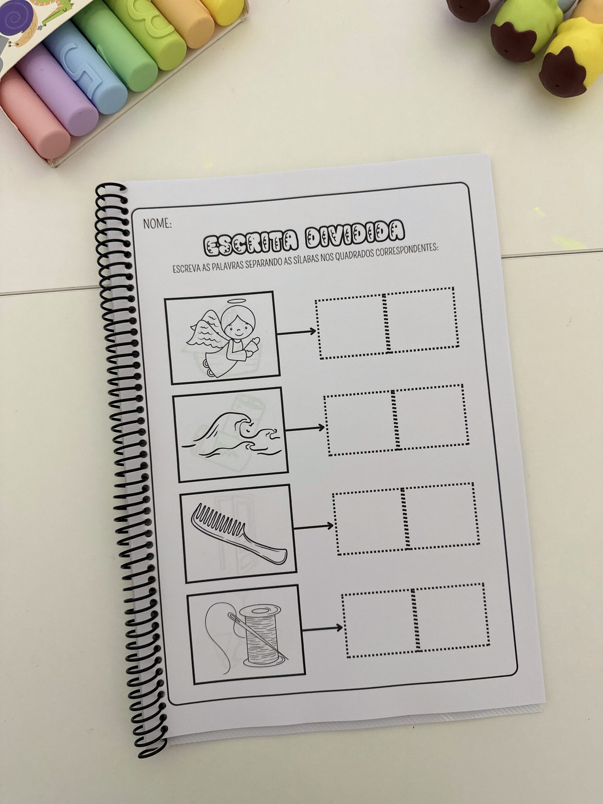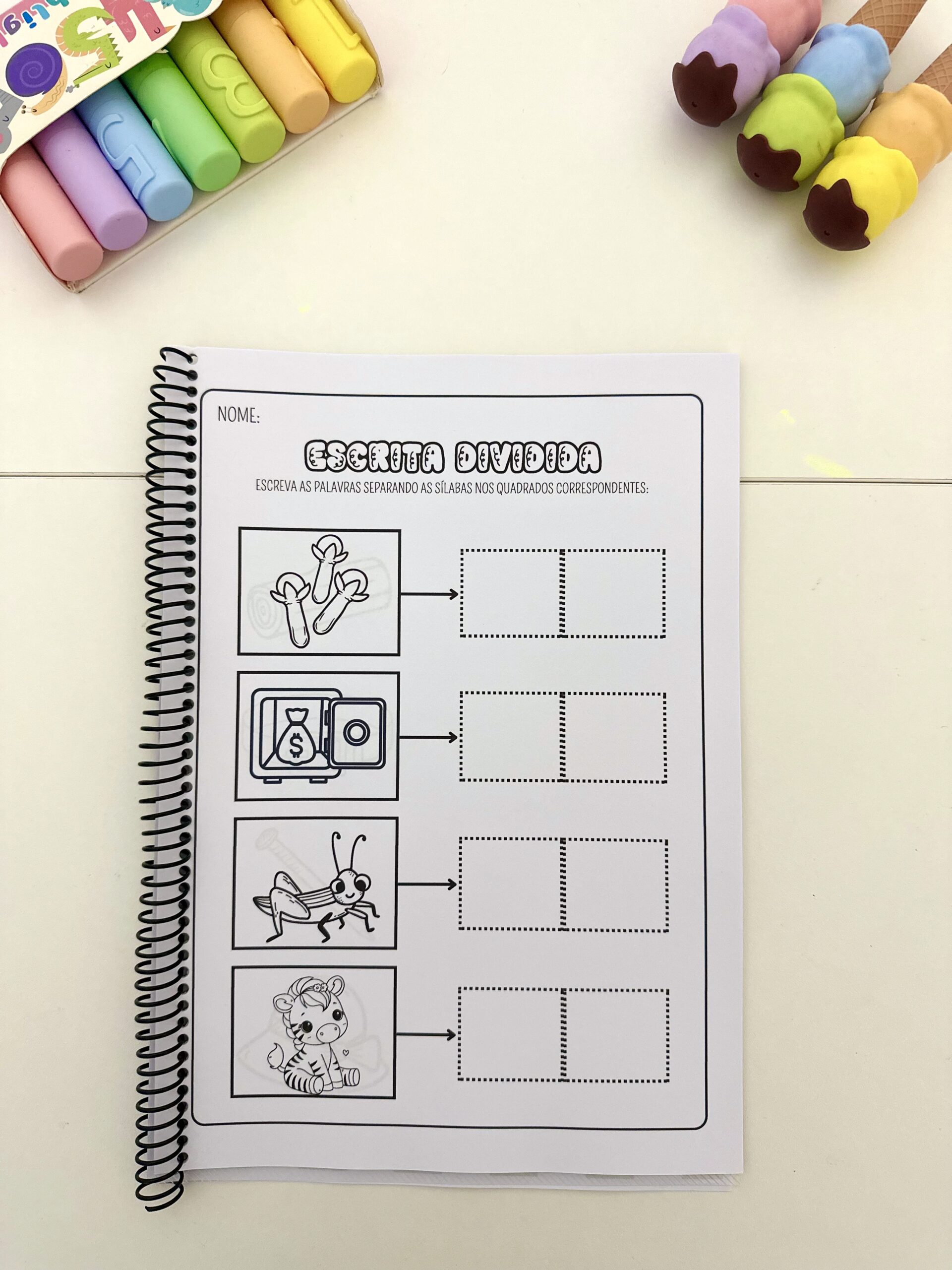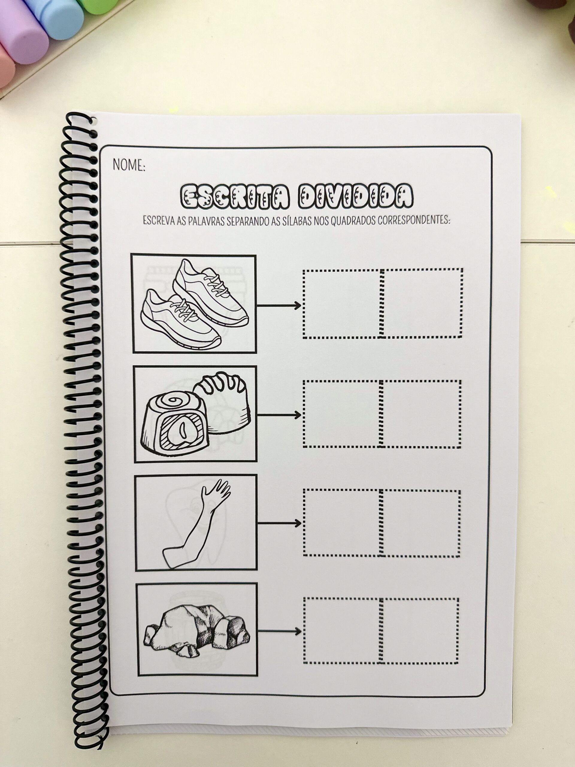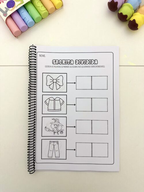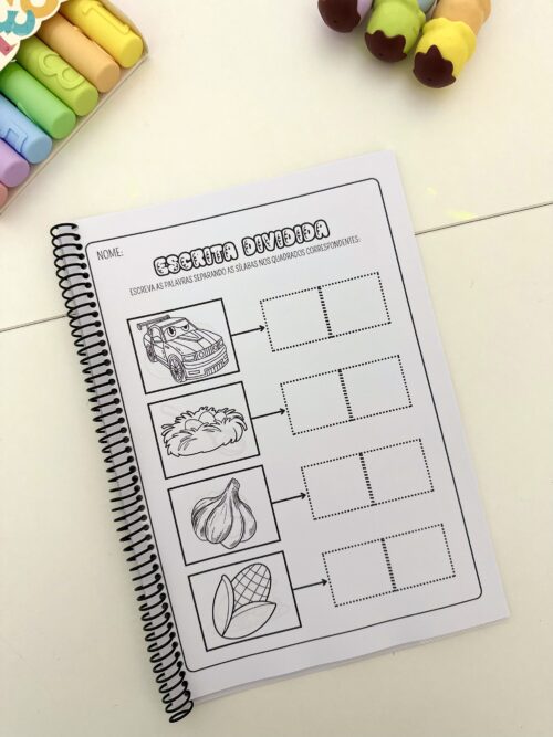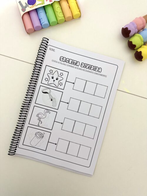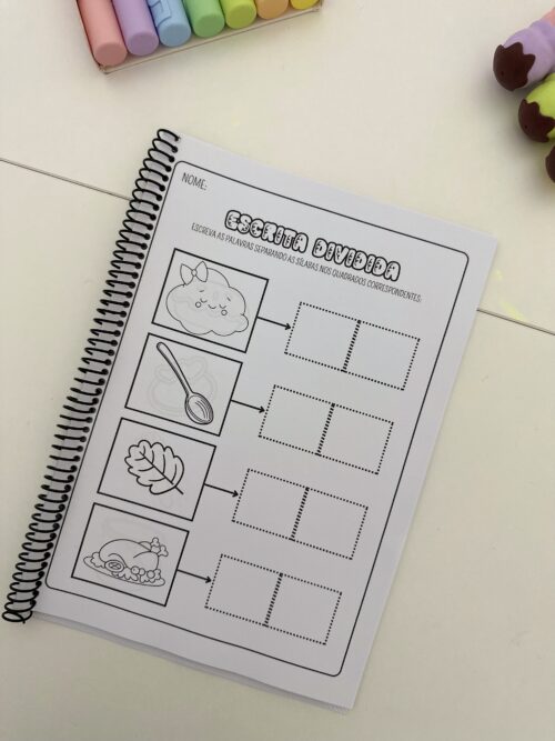 Estimular a escrita correta de palavras com sílabas complexas, desenvolver a habilidade de divisão silábica e promover a autonomia no momento da escrita.