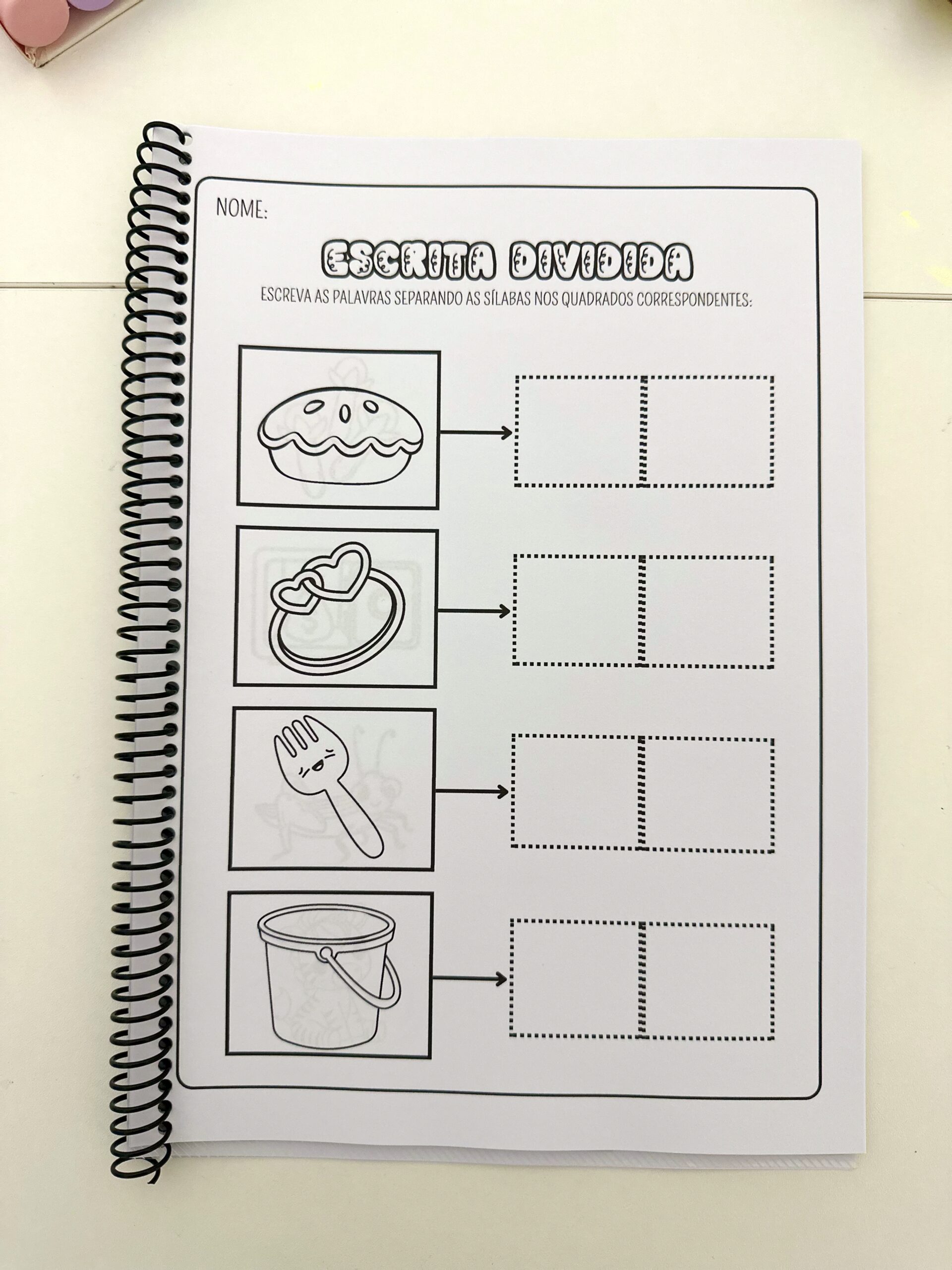A criança observará a figura, identificará a palavra e escreverá cada sílaba no espaço correspondente, organizando as partes da palavra de forma clara.