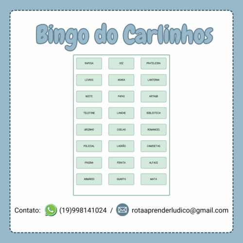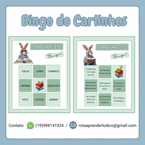 O recurso ‘Bingo do Carlinhos’ pode ser utilizado para realização de um estudo da interpretação de texto do livro ‘Procura-se! Carlinhos Coelho o ladrão de livros’. E tudo isso de uma forma bastante lúdica. Composto por cartelas que podem ser separadas e utilizadas com crianças em diferentes fases de aprendizagem, promovendo a diferenciação pedagógica. O material é disponibilizado em PDF e deverá ser impresso para uso. Sugere-se que seja impresso em papel A4 de gramatura superior (mais que 90 gramas) e, caso deseje conservá-lo, plastificar ou passar contact transparente. Também há necessidade de providenciar um dado de quatro faces e marcadores para os jogadores.