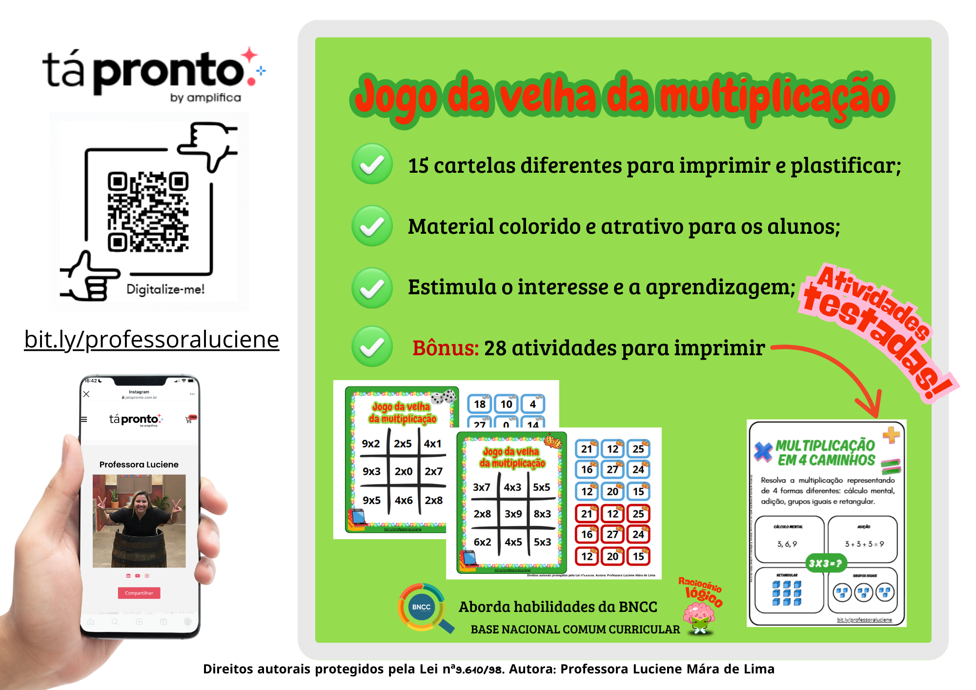 💡 Com o Jogo da Velha da Multiplicação, seus alunos vão praticar a tabuada de forma lúdica e engajadora. O material contém 15 cartelas diferentes, coloridas e prontas para imprimir e plastificar!
