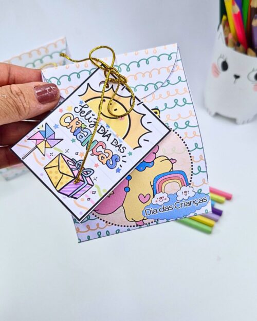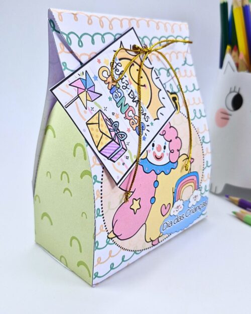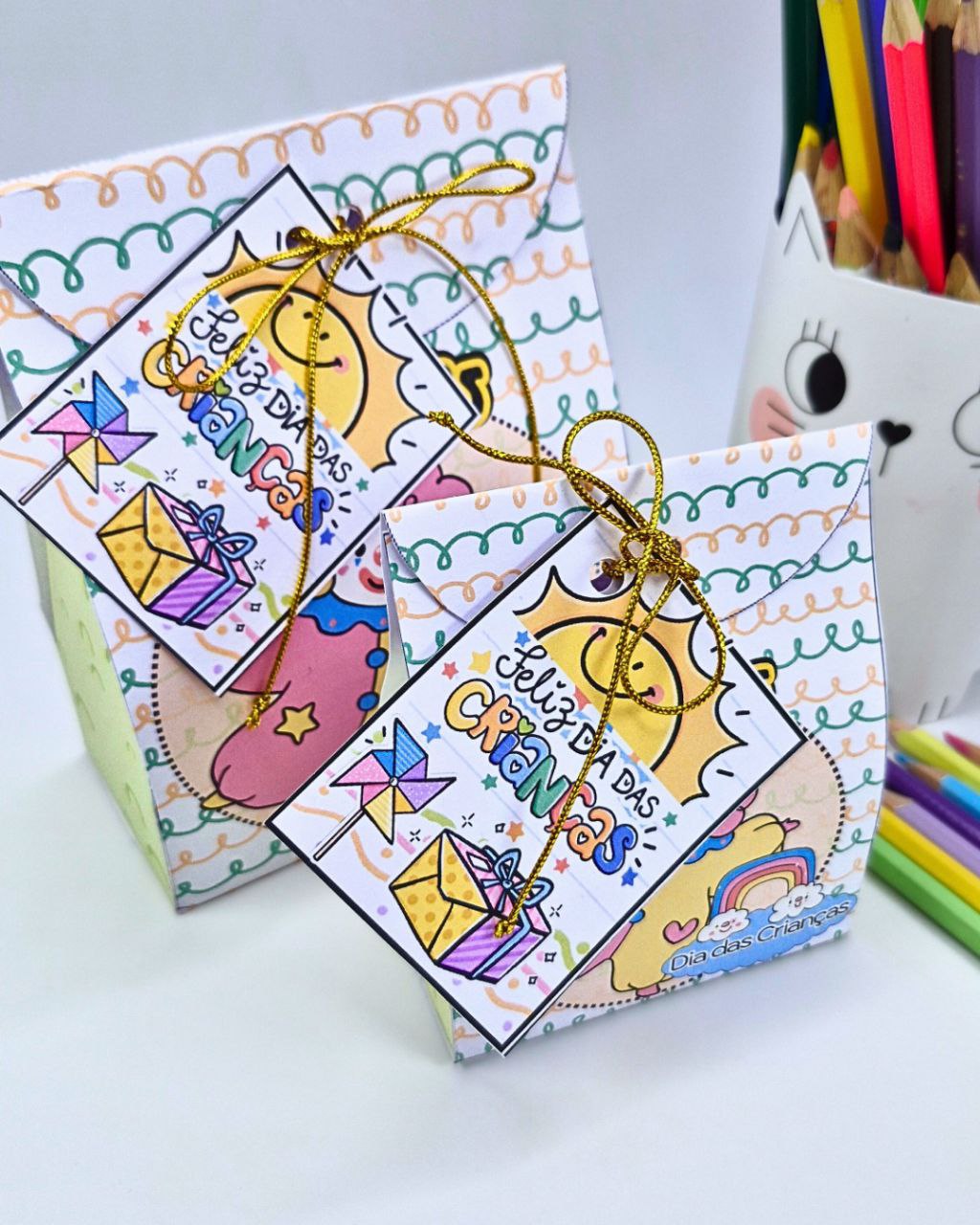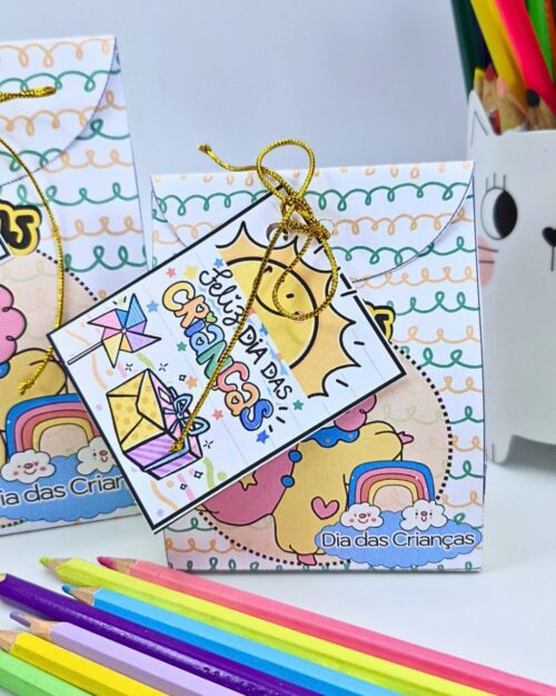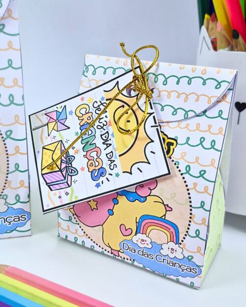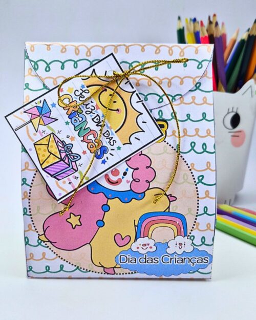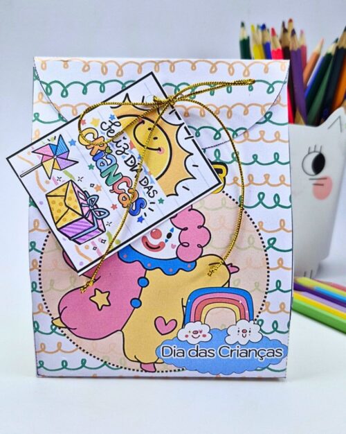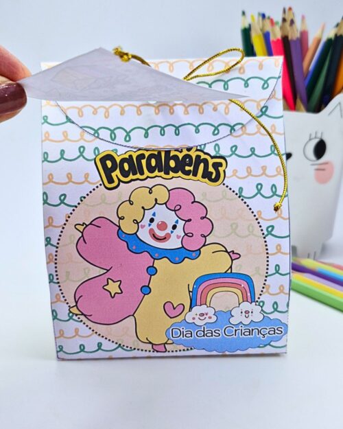 Contém uma lembrancinha temática do Dia das Crianças, com a frase “Parabéns – Dia das Crianças”.