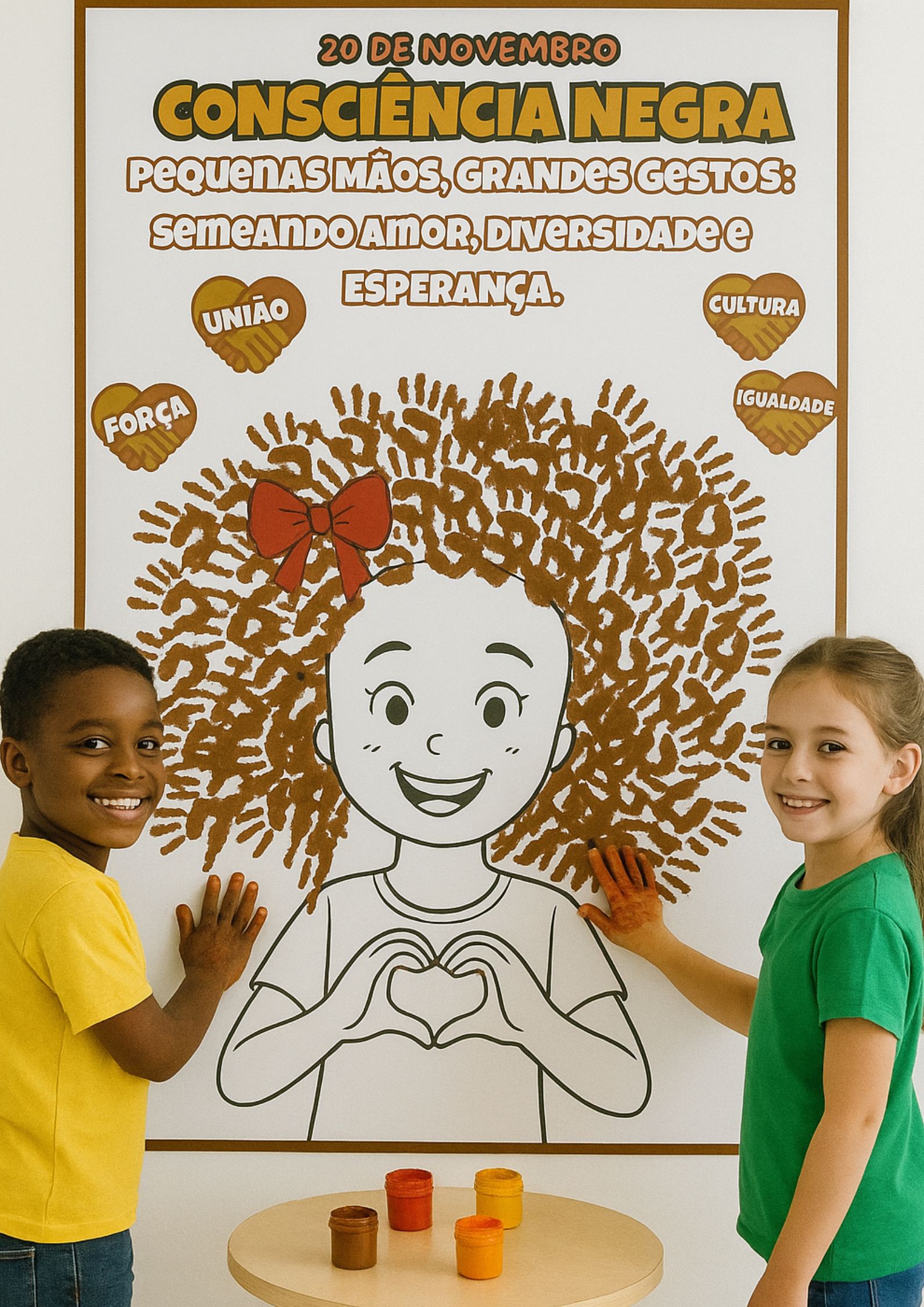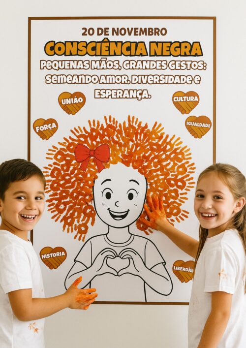👉 Esse painel é ideal para atividades coletivas em sala de aula, permitindo que as crianças participem ativamente da pintura com as mãos, valorizando a diversidade, a inclusão e o respeito à cultura afro-brasileira.