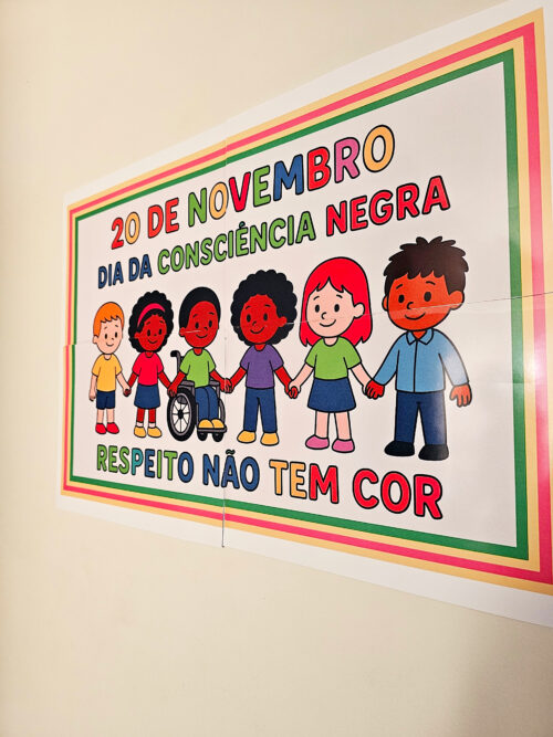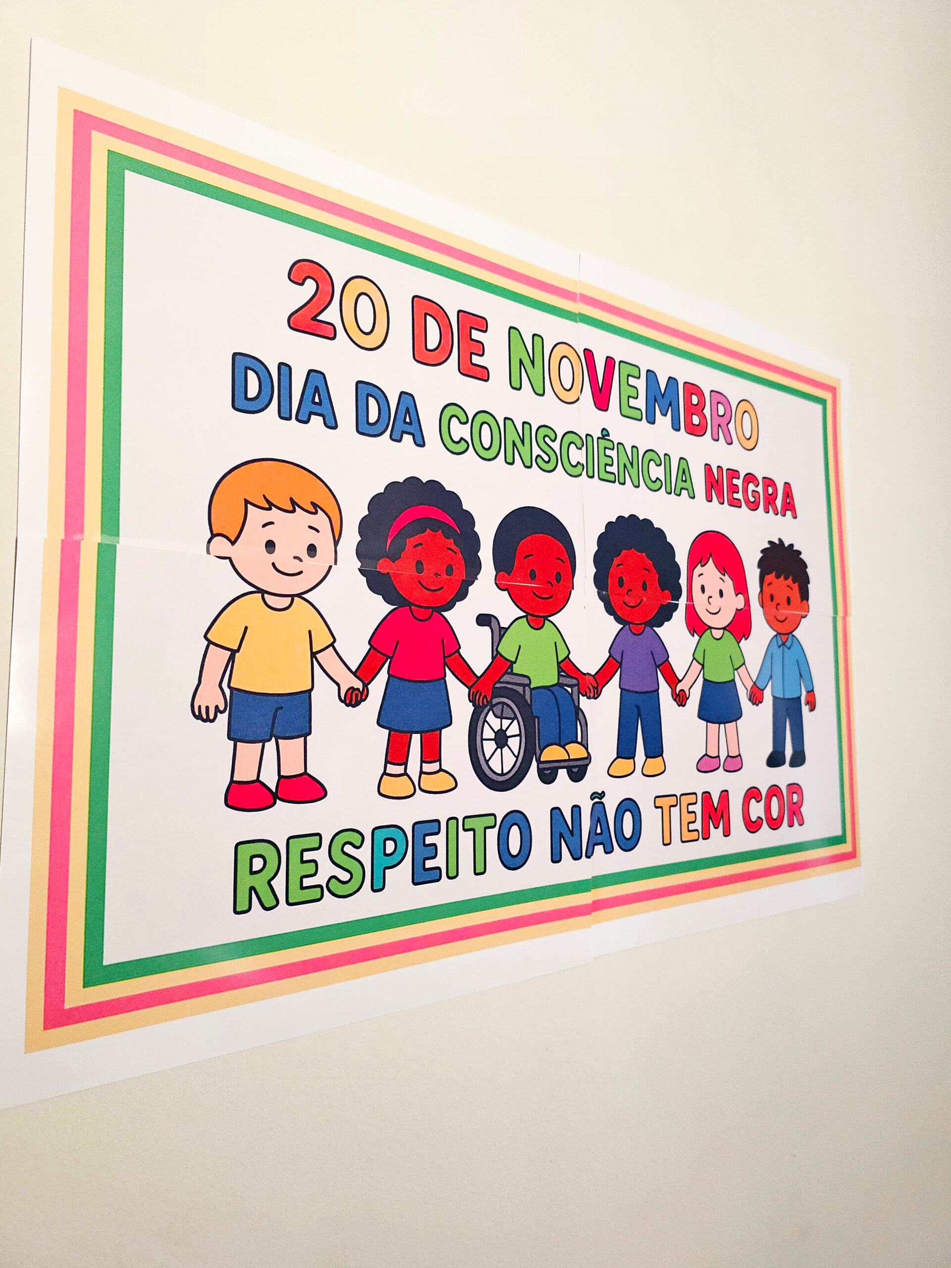 Com ilustrações de crianças diversas e a mensagem central “Respeito não tem cor”, o painel promove reflexões sobre igualdade, inclusão e respeito às diferenças, tornando-se um recurso pedagógico valioso para escolas e eventos.
