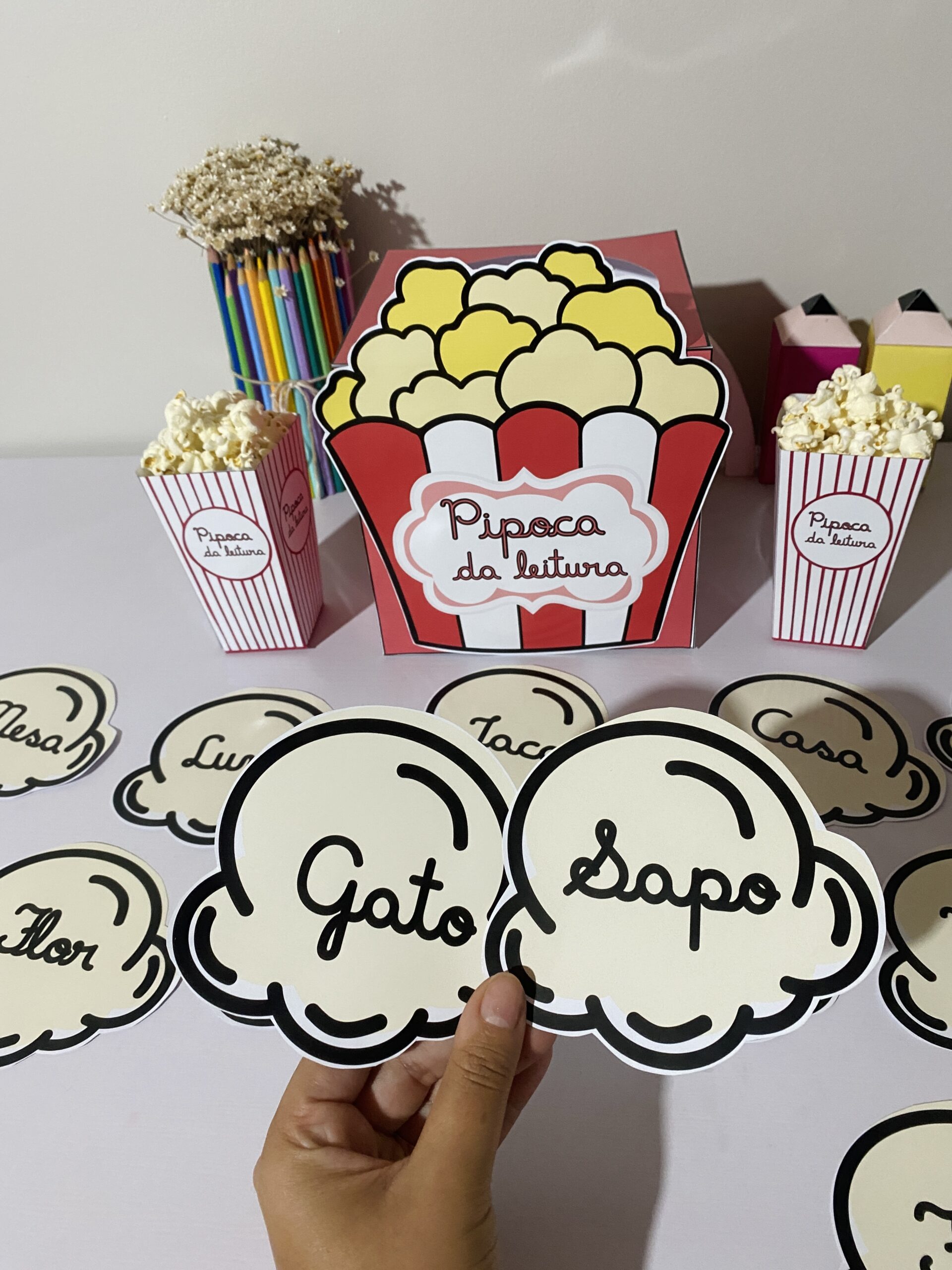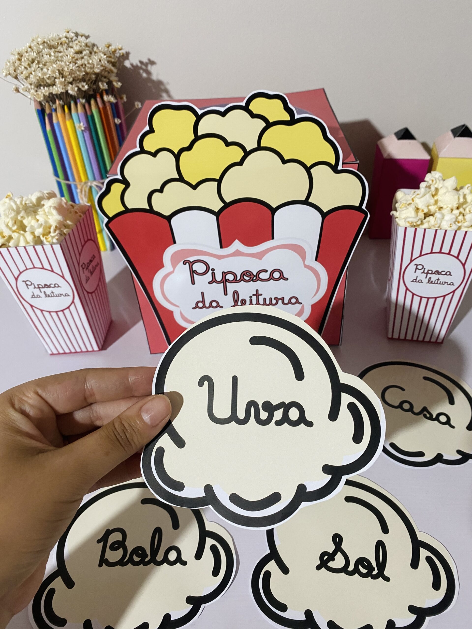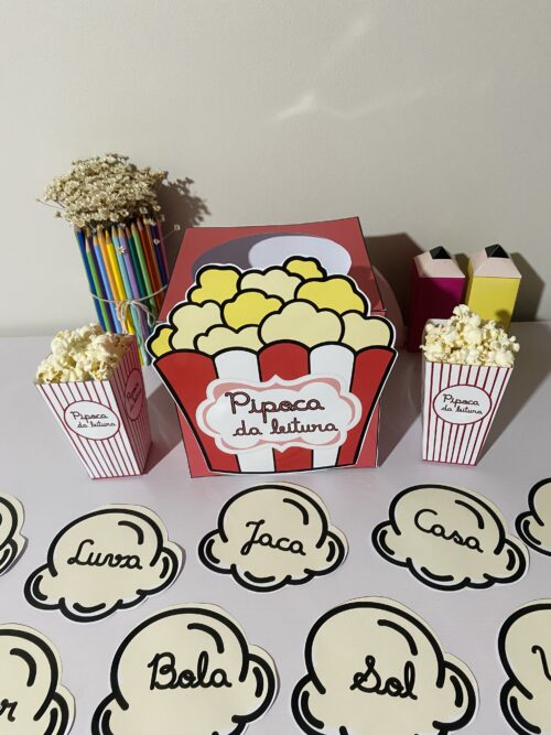 Monte a caixa “Pipoca da Leitura” e coloque dentro bilhetes com palavras, sílabas ou títulos de histórias.