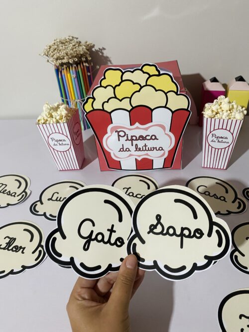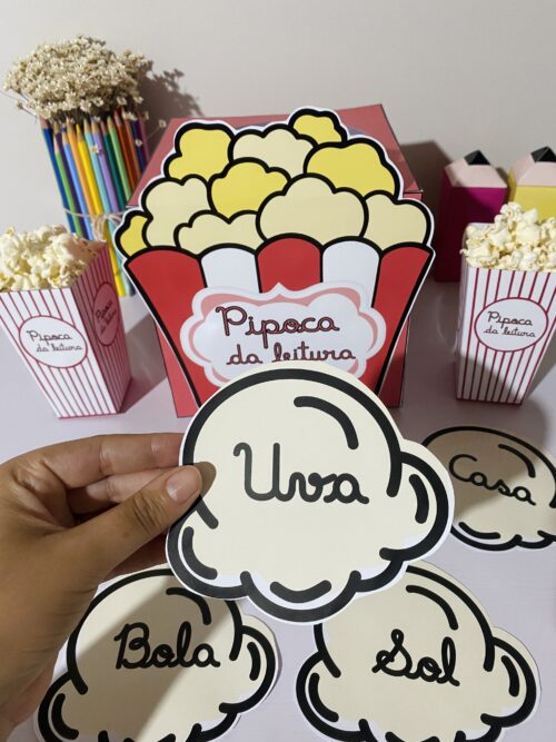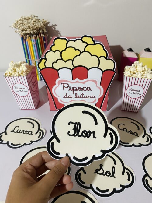 Cada criança “pega uma pipoca” e lê o que está escrito — uma forma divertida de envolver toda a turma!
