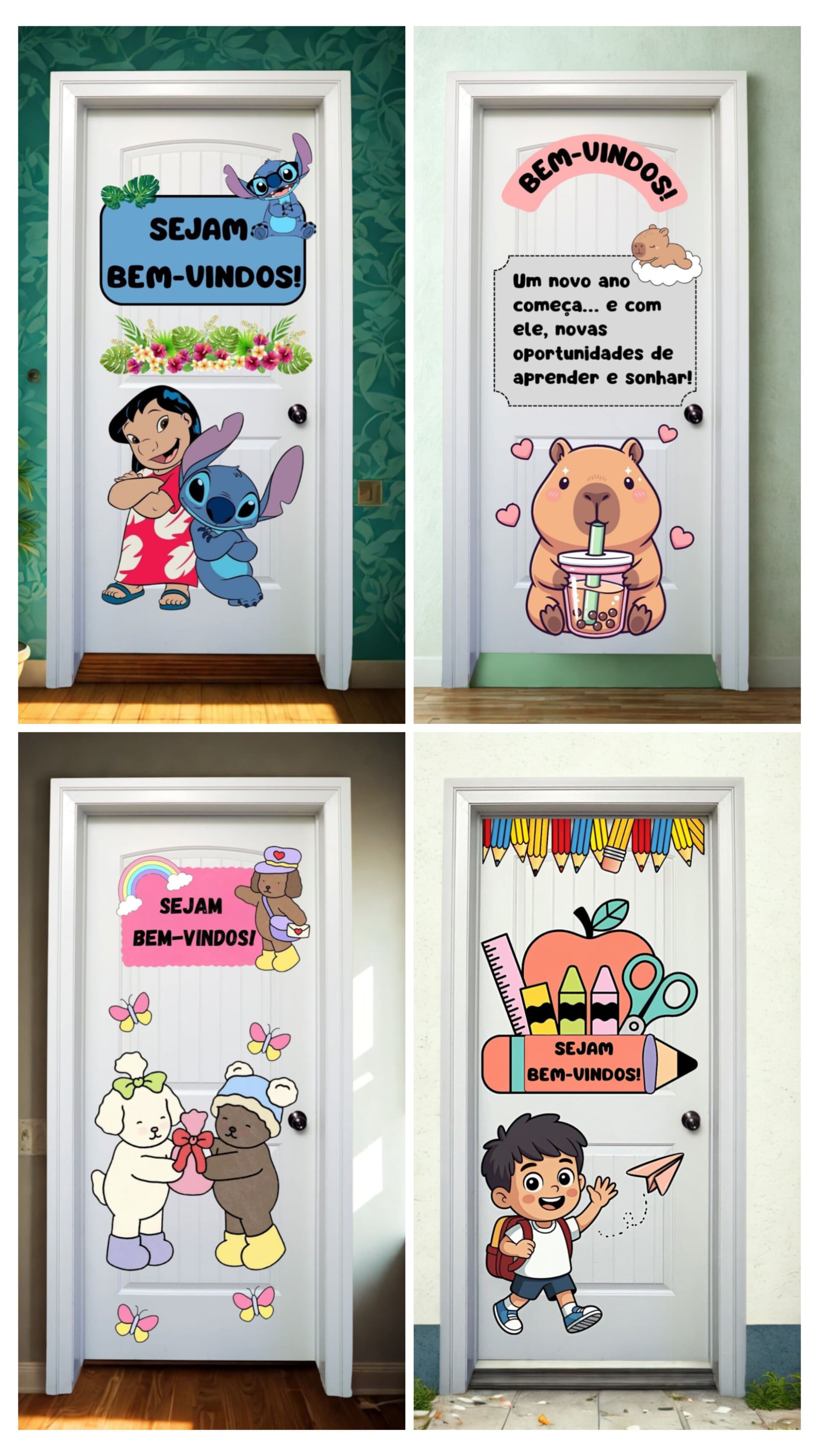 Receba seus alunos com carinho, cor e magia desde a entrada da sala! Esse kit traz 4 painéis lindos e acolhedores, perfeitos para transformar a porta da sala em um espaço de afeto e boas-vindas. Temas: Boobie Goods, Material Escolar, Capivara e Stitch.