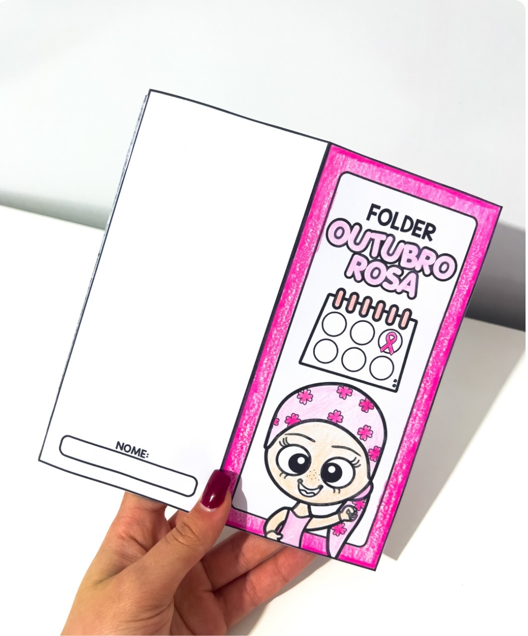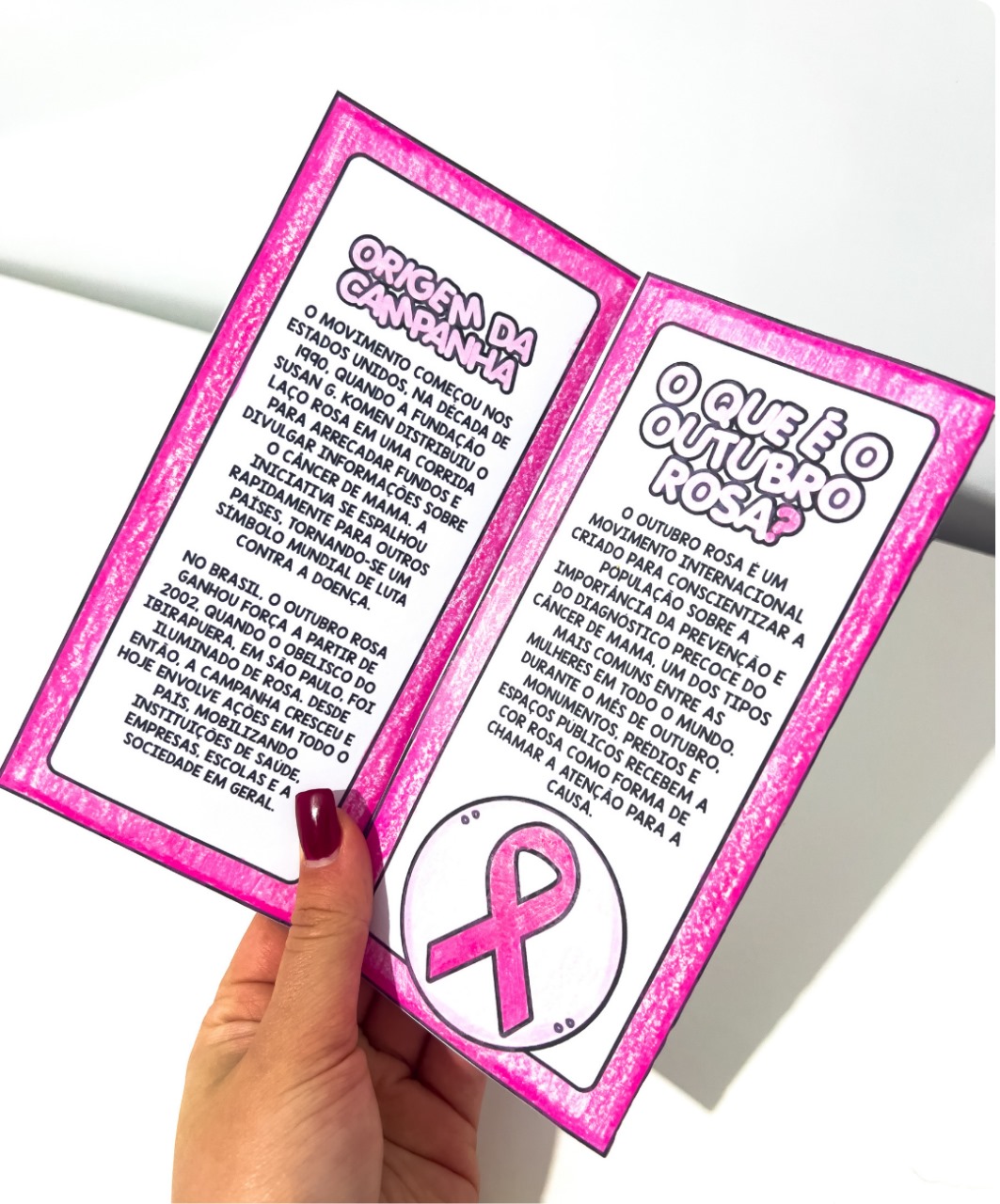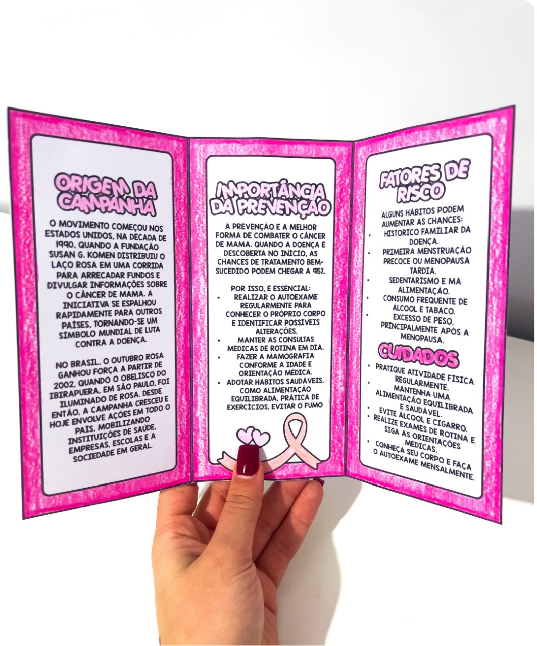 O folder traz informações simples e adaptadas sobre o significado do outubro Rosa, a importância do cuidado com a saúde e maneiras pelas quais as crianças podem participar desse movimento de carinho e apoio.