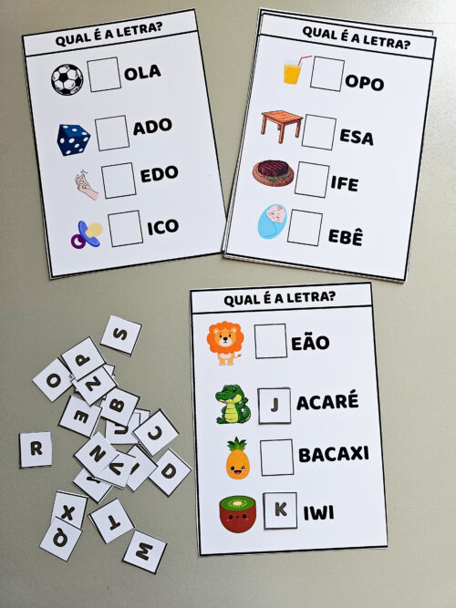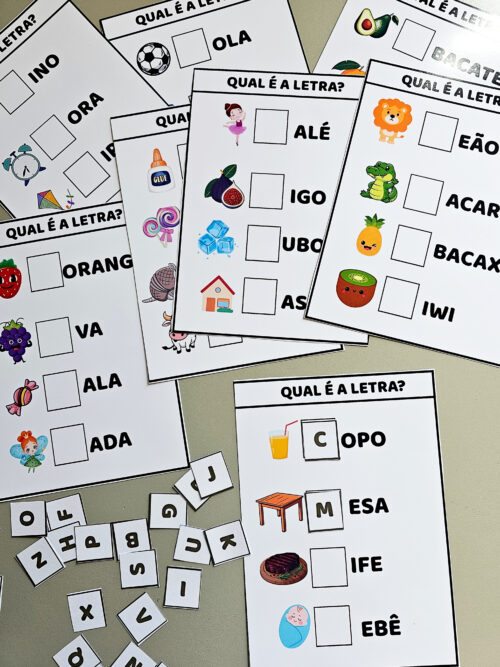 Atividades de completar palavras com letras que faltam, estimulando leitura, escrita, atenção e consciência fonológica de forma divertida.