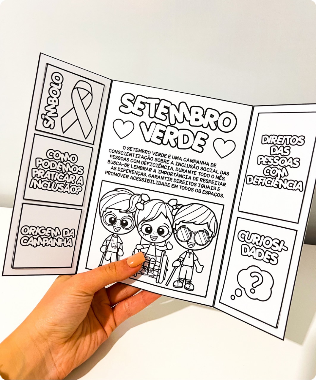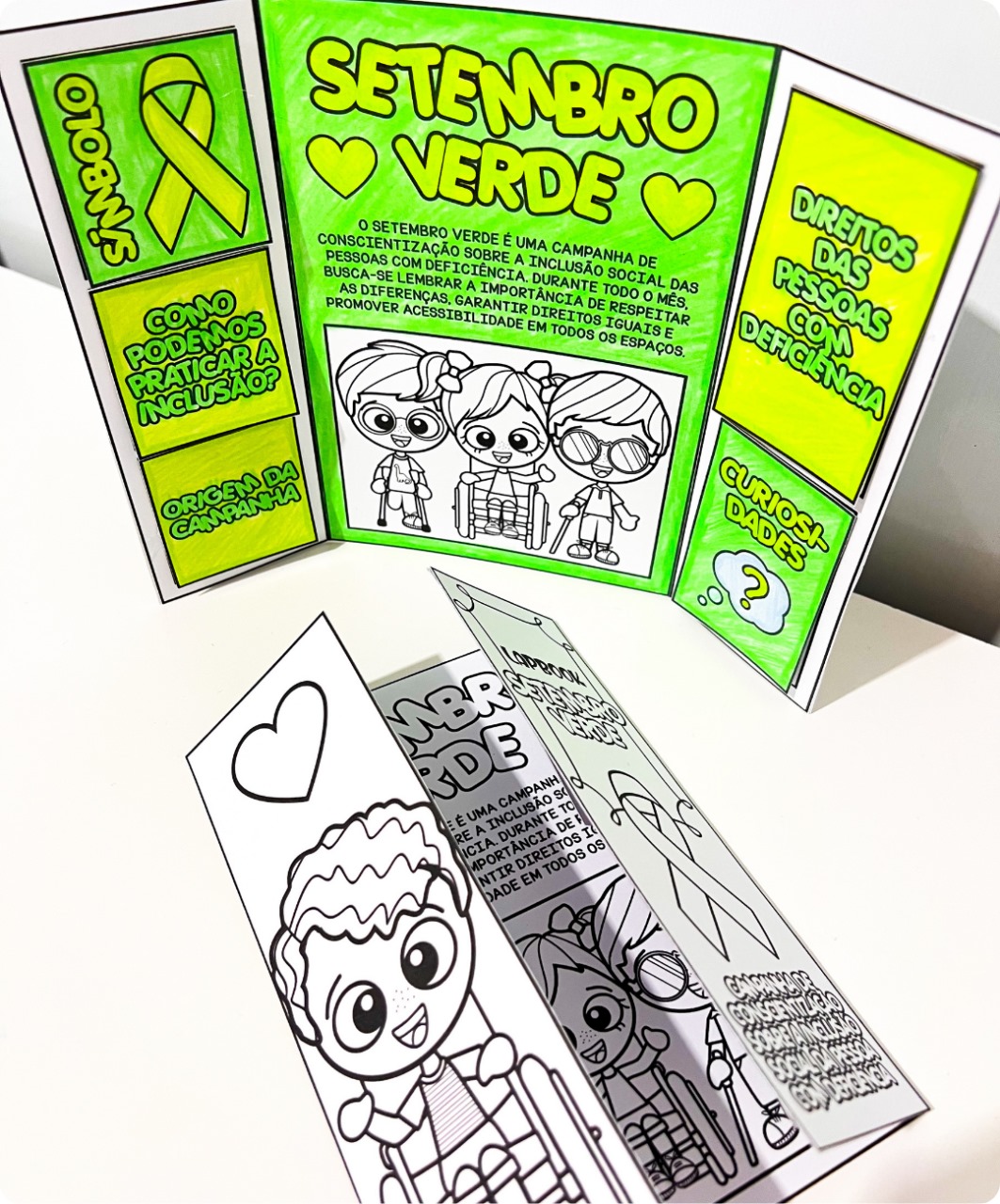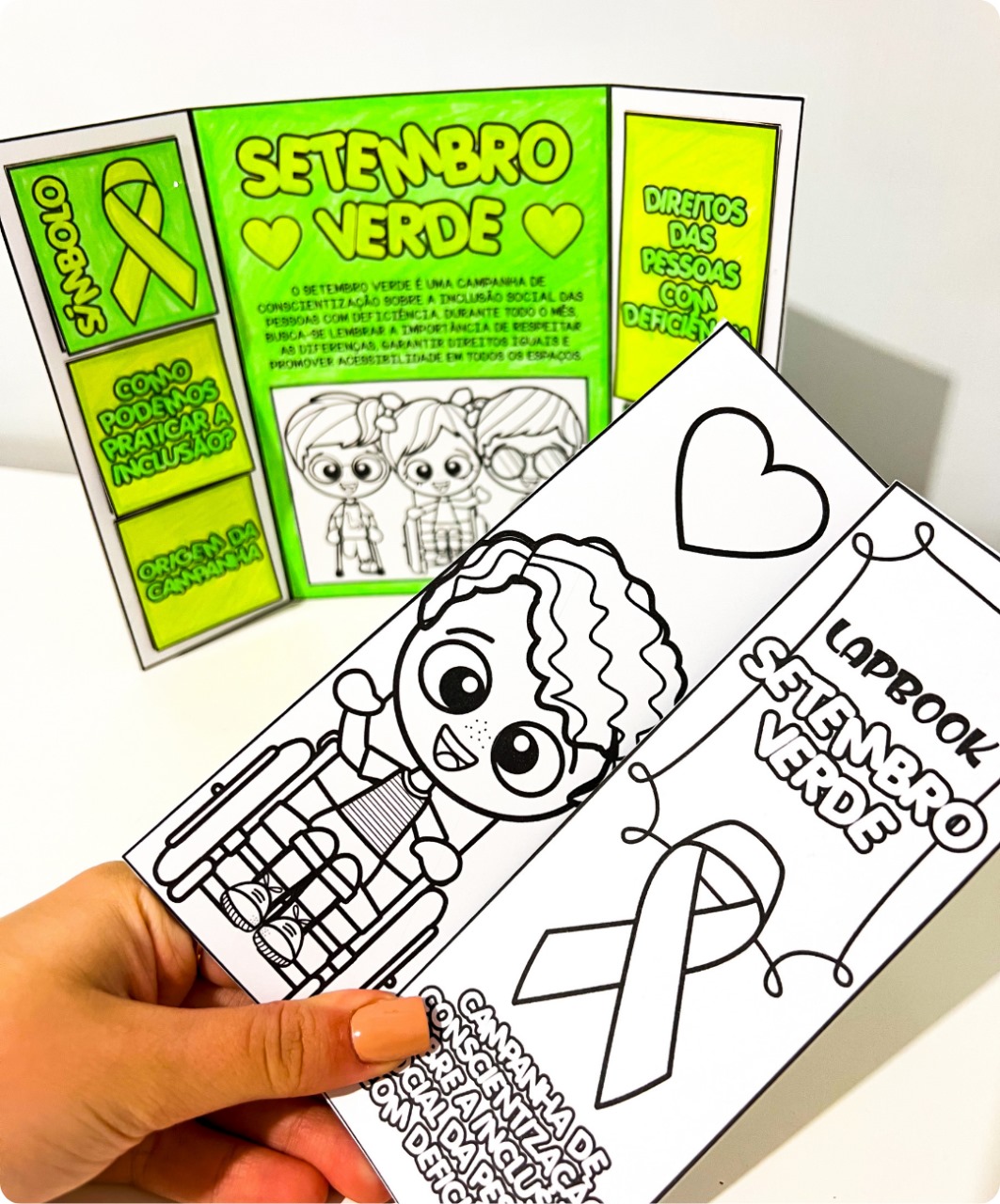 Esse material da imagem é um lapbook sobre o setembro Verde, criado com o objetivo de trabalhar a conscientização e a inclusão das pessoas com deficiência.