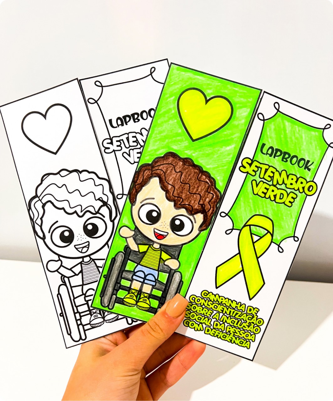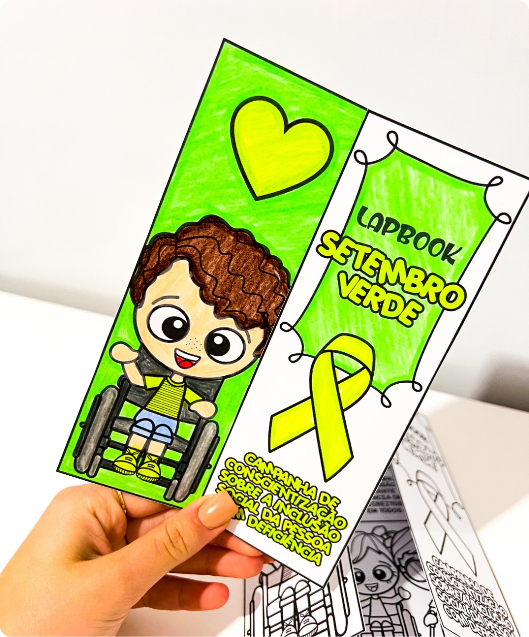 Ao centro, o lapbook apresenta a explicação da campanha Setembro Verde e ilustrações de crianças diversas, incluindo personagens com deficiência, reforçando visualmente a mensagem de igualdade, respeito e acolhimento.