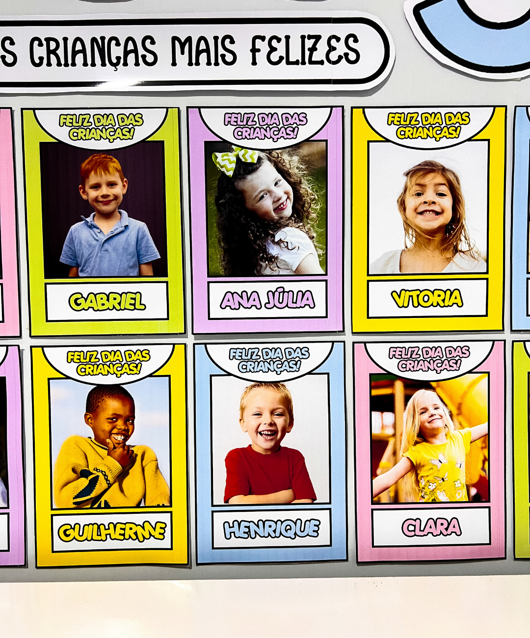 Ideal para decorar salas de aula, murais escolares ou espaços comemorativos, o painel destaca o tema da pesquisa com o título “Turma com as crianças mais felizes”, celebrando o protagonismo e a alegria dos pequenos.