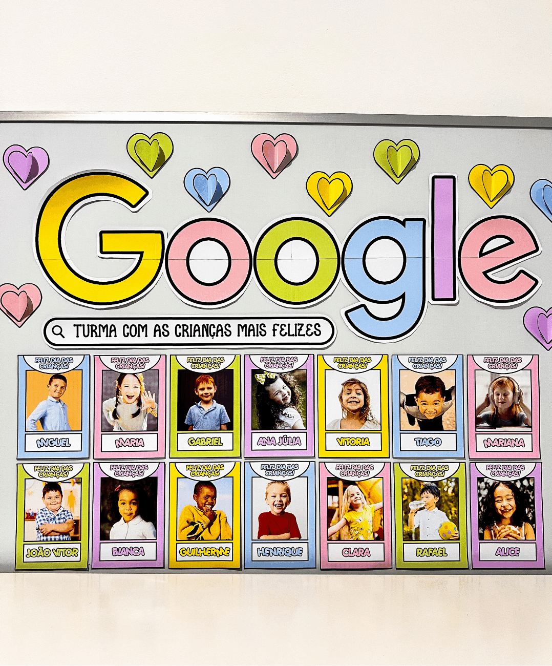 Colorido, envolvente e cheio de carinho, o Painel Google Dia das Crianças é perfeito para registrar momentos especiais, promover a autoestima e valorizar cada aluno de forma criativa.