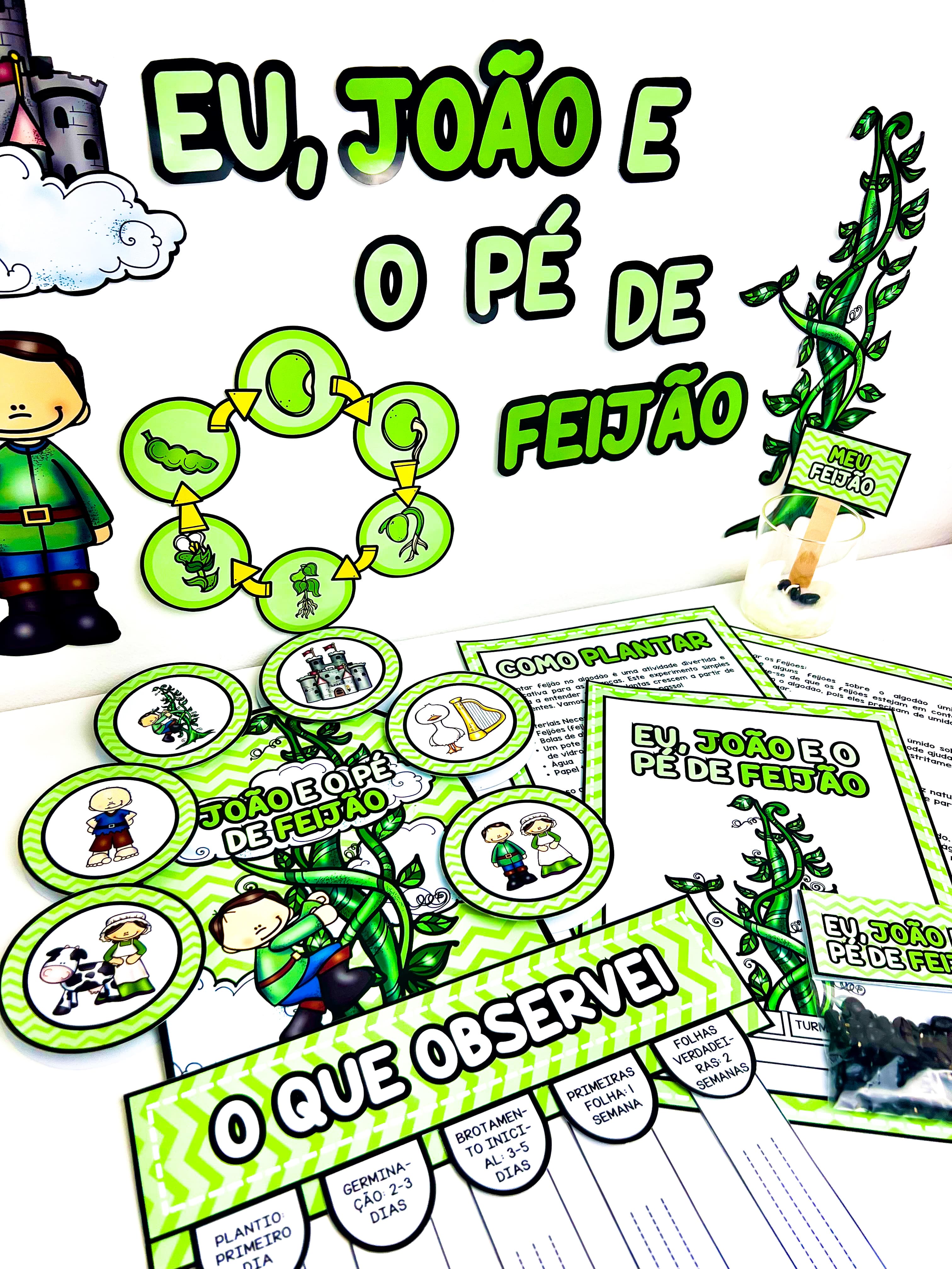 Sequência didática do conto infantil João e o Pé de Feijão acompanhado da dinâmica de germinação e feijões no algodão.