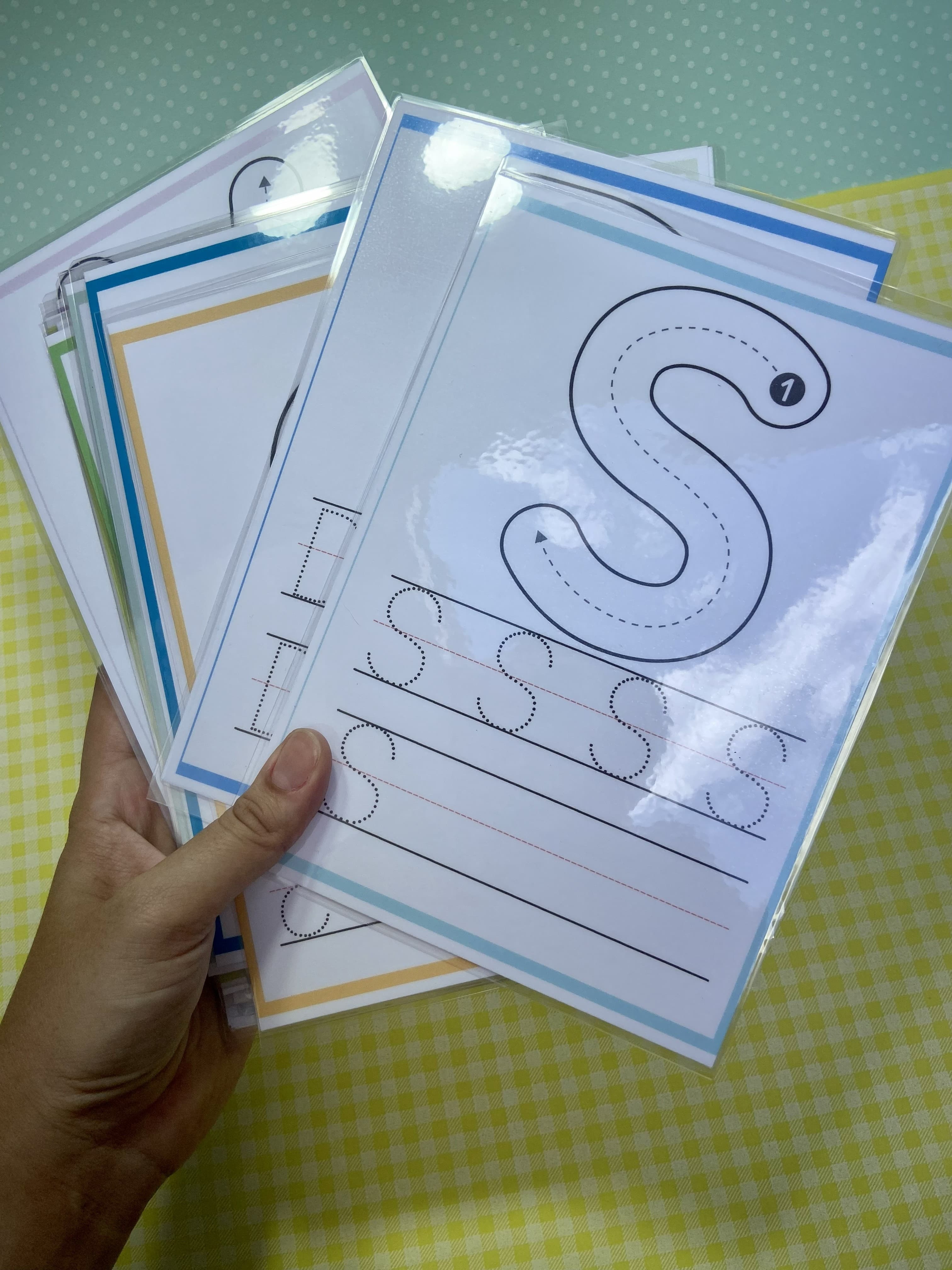 As Fichas para Treino do Alfabeto incluem todas as letras do alfabeto na opção bastão maiúscula e minúscula, com orientação de traçado e espaço para a criança realizar a escrita com e sem apoio de pontilhados.