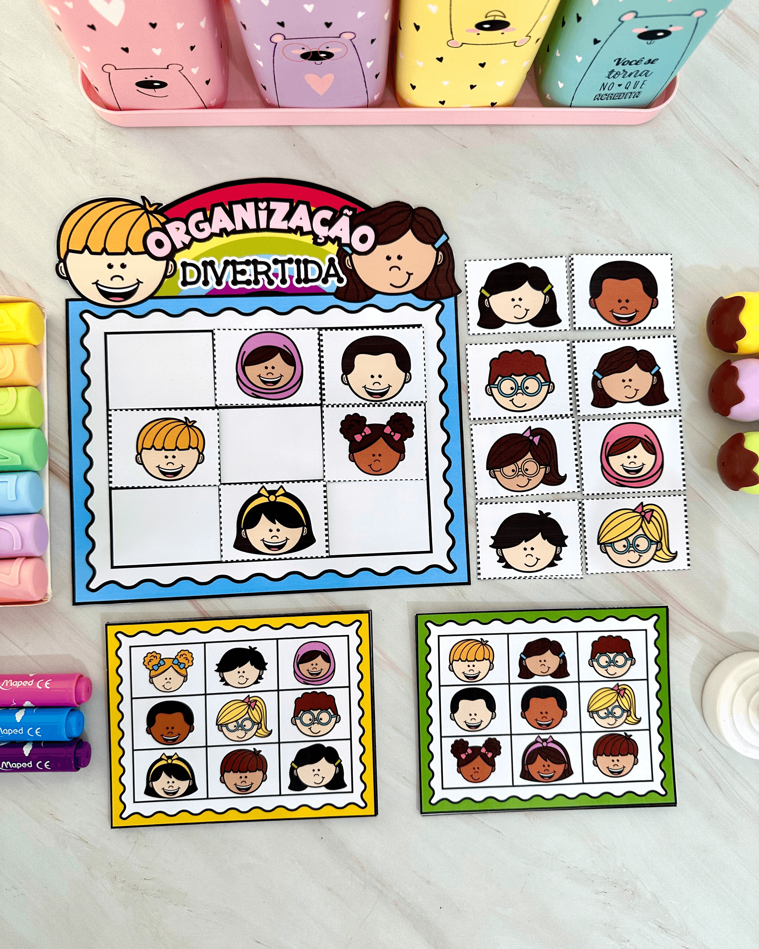 O arquivo 'Organização Divertida' é um recurso pedagógico projetado para desenvolver habilidades de organização de maneira lúdica e interativa com crianças da Educação Especial.