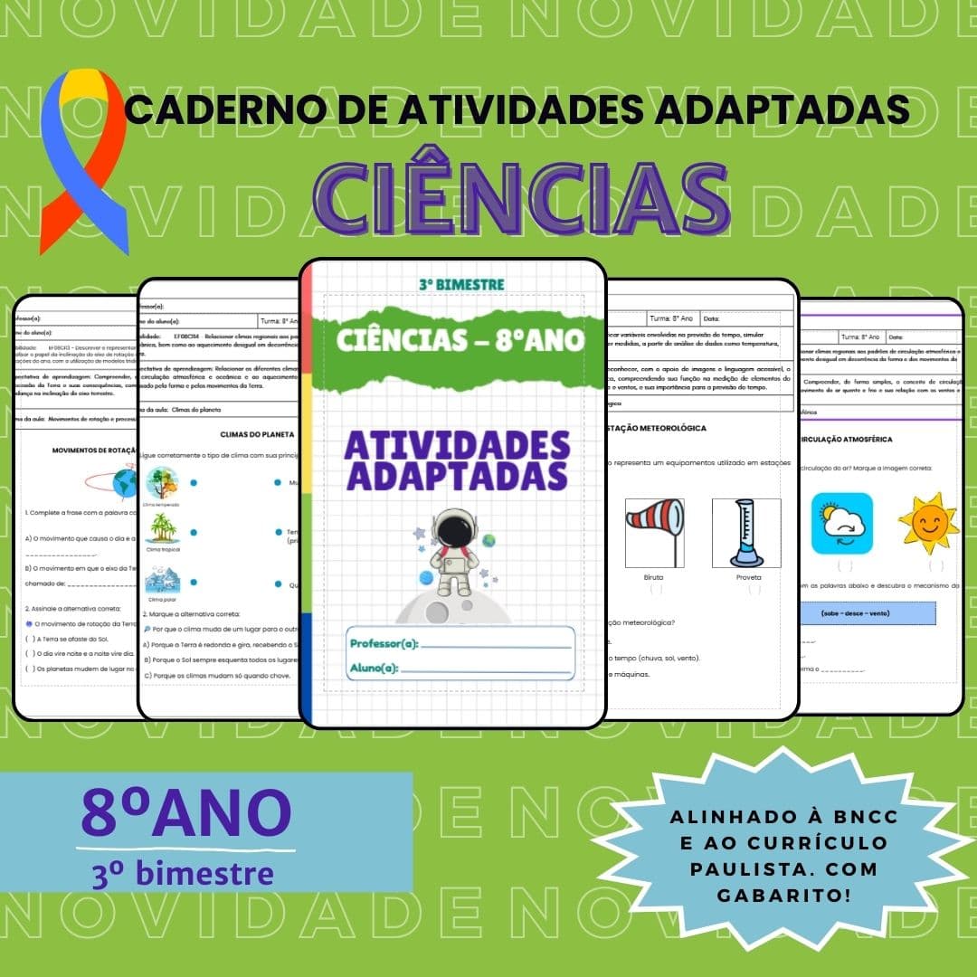 Este material exclusivo reúne atividades adaptadas de Ciências cuidadosamente planejadas para atender às necessidades de alunos do Ensino Fundamental II, com foco em estudantes com Transtorno do Espectro Autista (TEA), dificuldades de aprendizagem ou que demandam recursos mais visuais e objetivos.