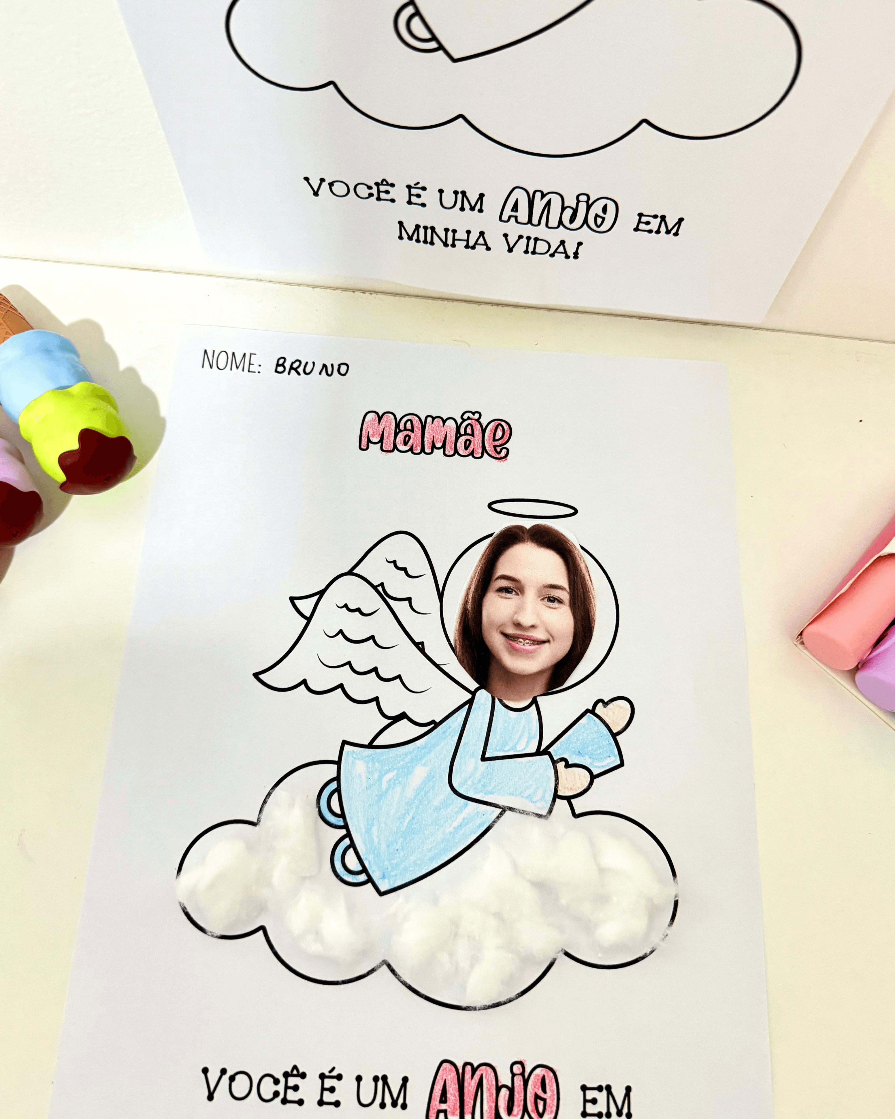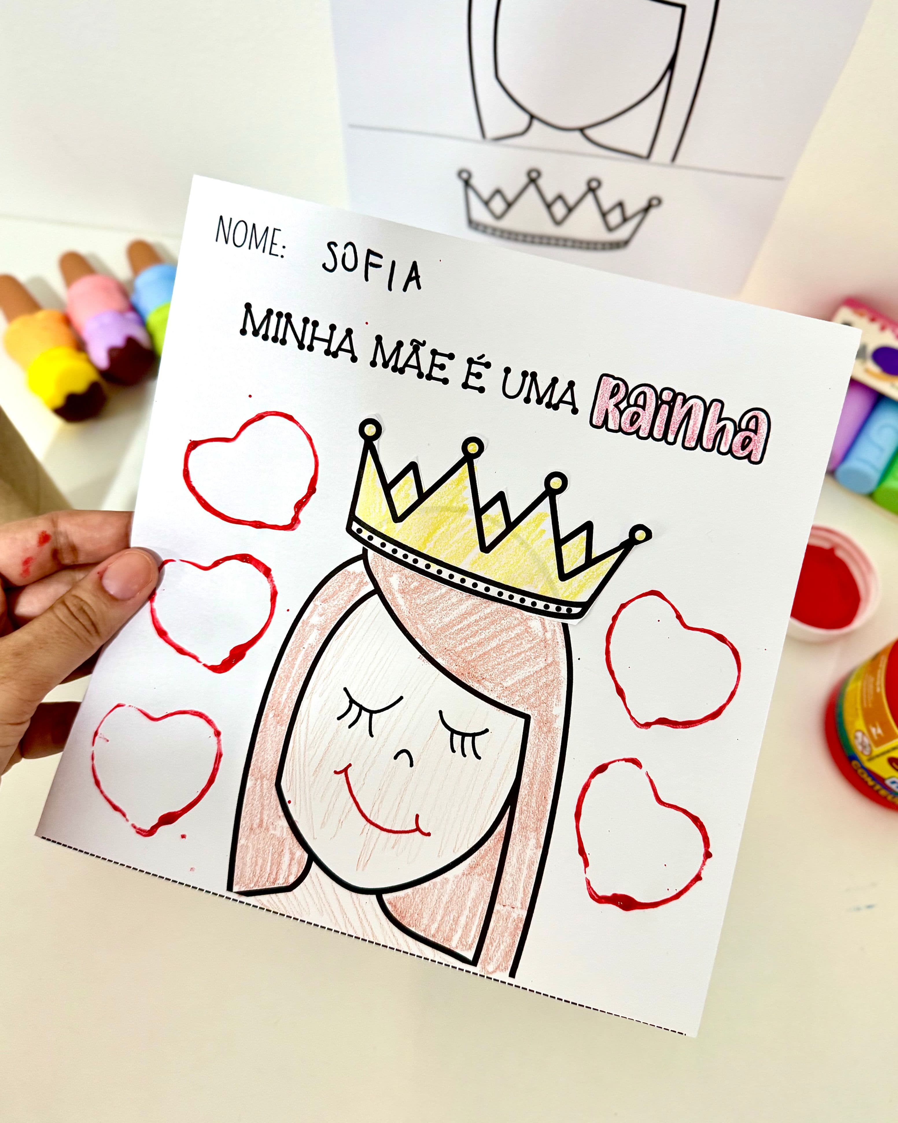corações, além de uma linda ilustração de uma mãe com coroa. Ideal