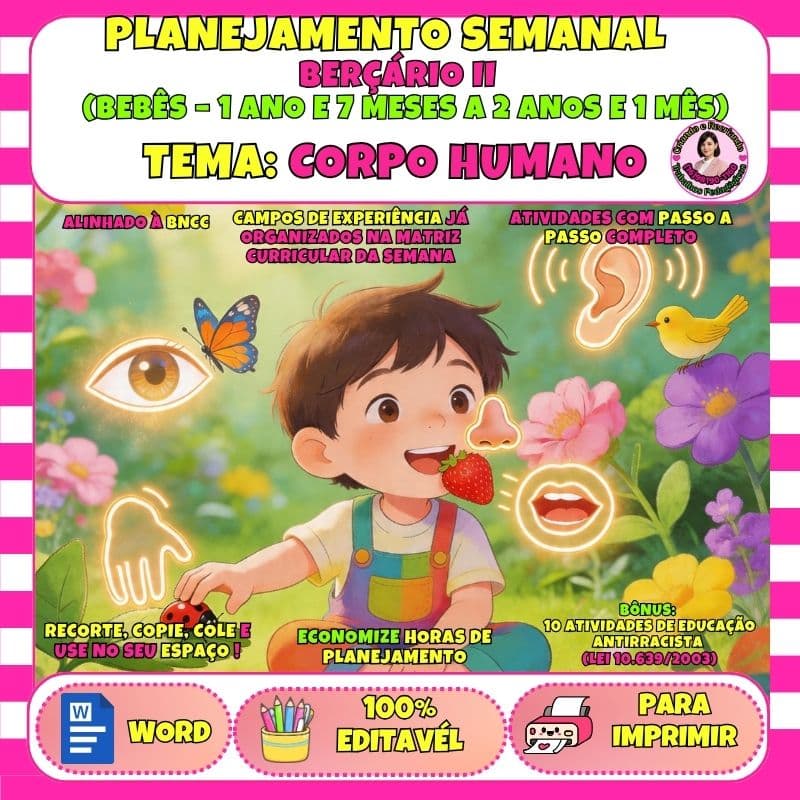 Planejamento completo para Berçário II com tema Corpo Humano, alinhado à BNCC, com atividades sensoriais, motoras, musicais e antirracistas, pronto para uso e totalmente editável.
