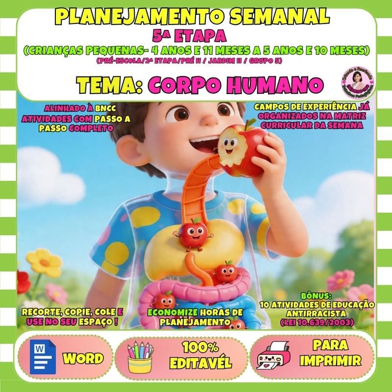 Planejamento semanal completo sobre Corpo Humano para 4ª etapa da Educação Infantil, alinhado à BNCC, com atividades práticas, lúdicas e organizadas para facilitar a rotina do professor.