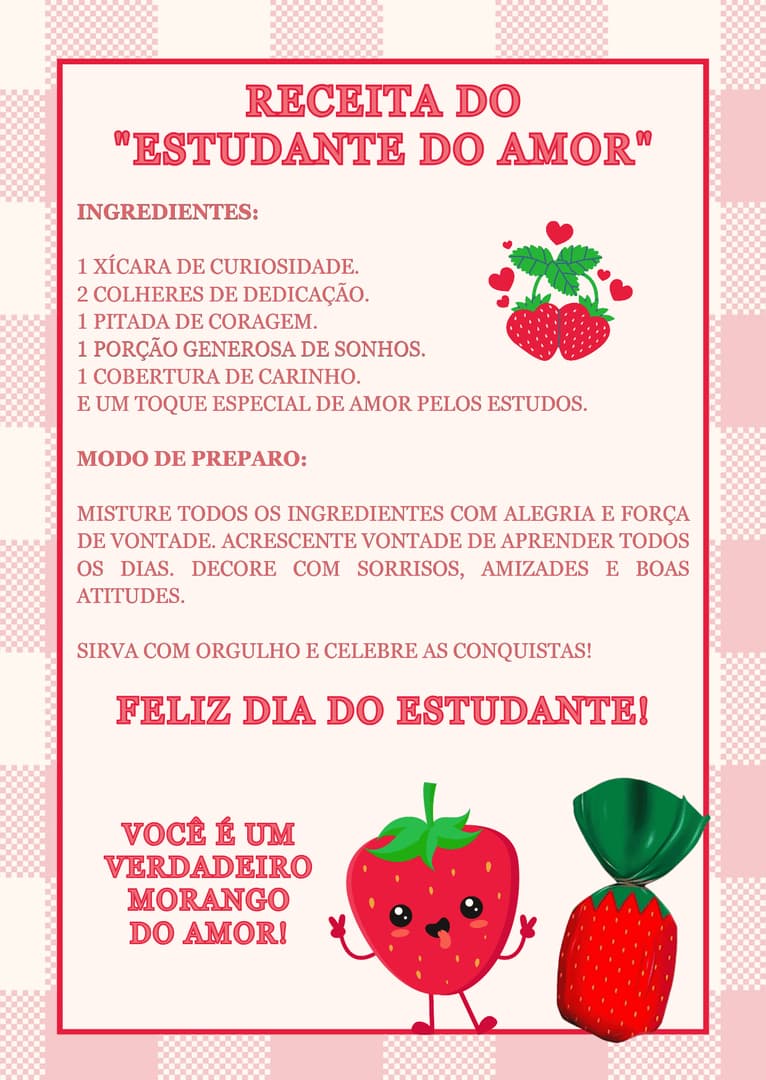 Cartão para o Dia do Estudante com sabor do amado morango do amor! Estas receitas vão adoçar seus alunos!