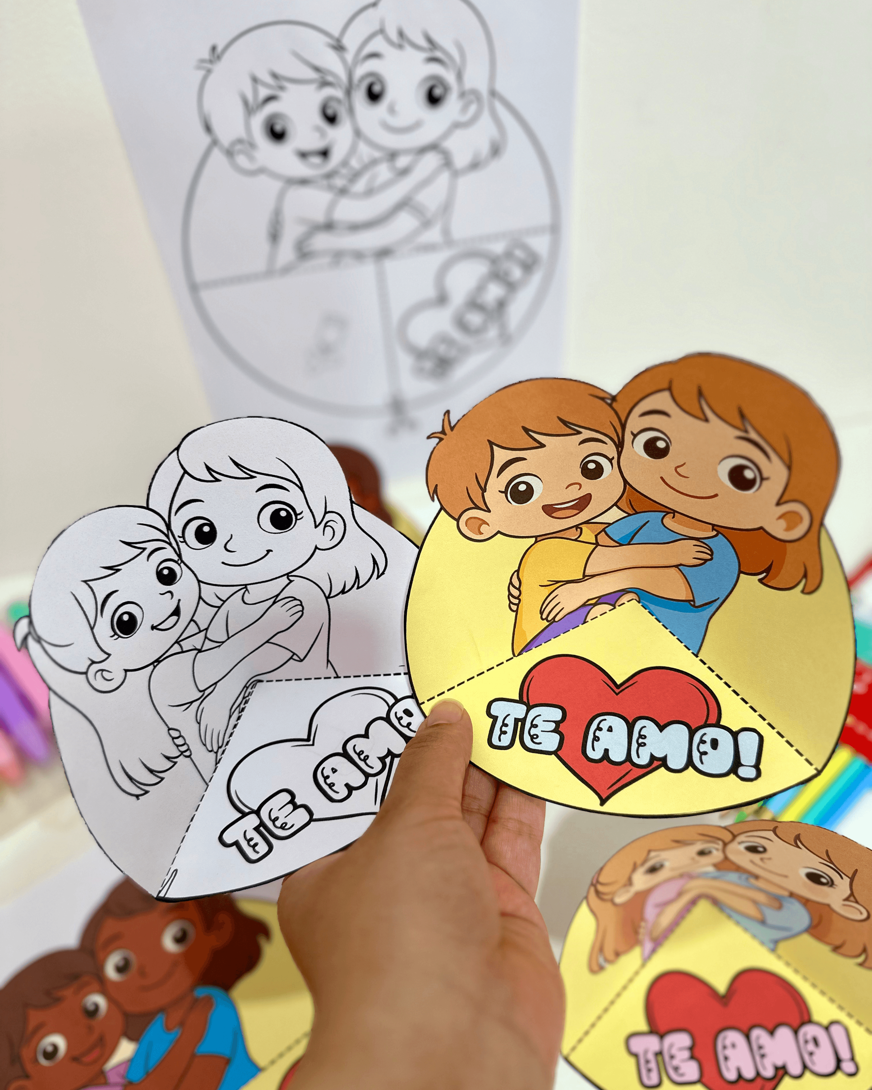 — Flores inclusas para as crianças colorirem, desenharem ou escreverem o nome da mãe.
