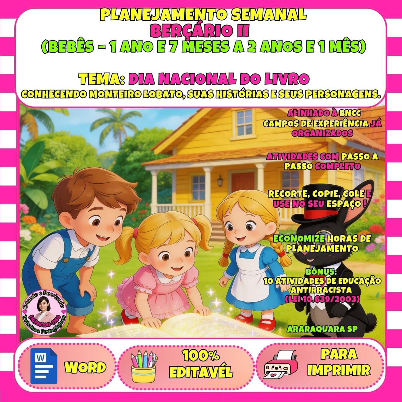 Planejamento completo Berçário II: Dia do Livro e Monteiro Lobato. Alinhado à BNCC para bebês, com 10 atividades antirracistas e arquivo 100% editável. Estimulação sensorial e autoridade pedagógica em cada página!