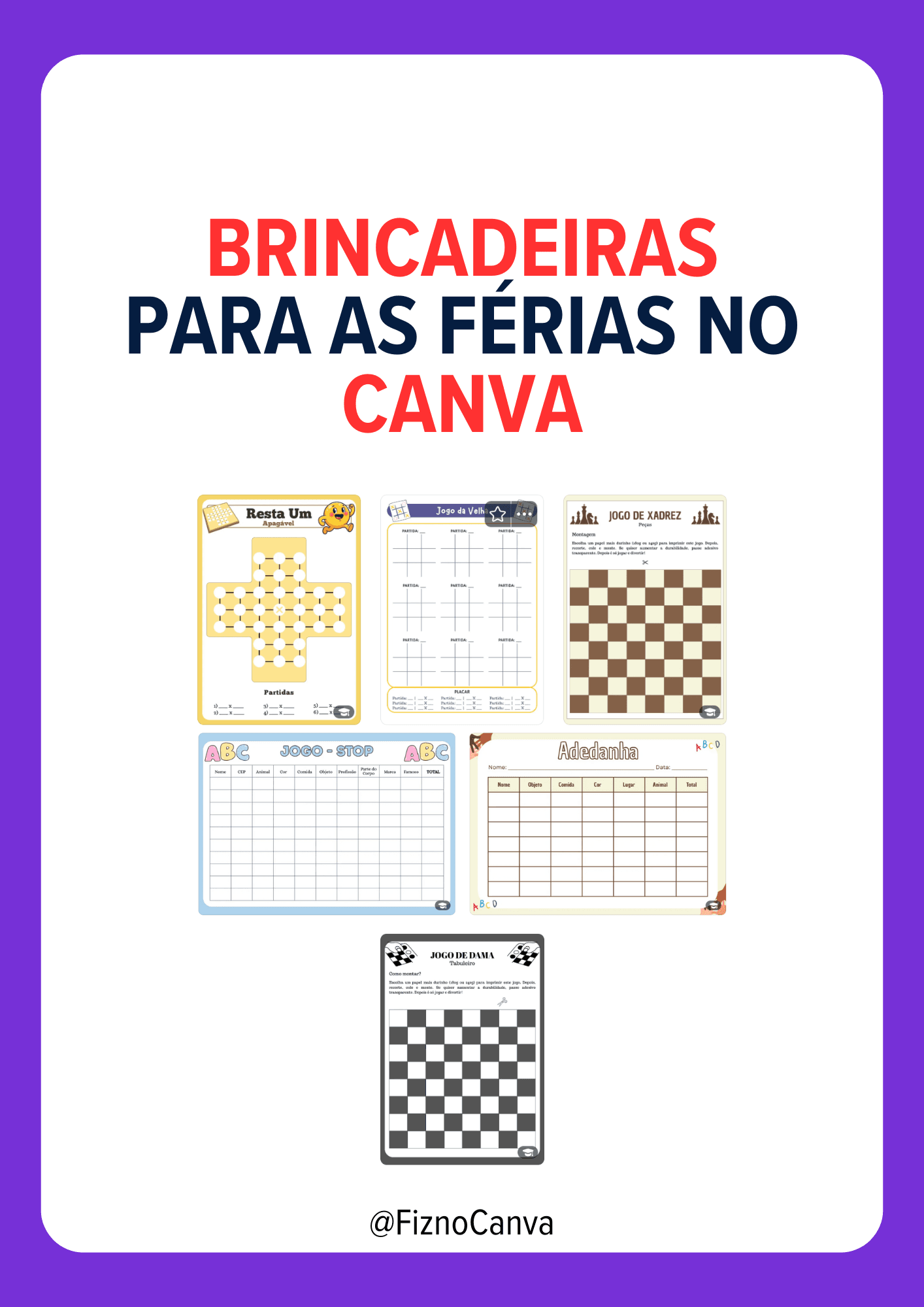 Este Kit de Jogos é para qualquer idade aproveitar as férias com a cabeça funcionando. Vem com Jogo de Dama, Xadrez, Resta Um, Jogo da Velha e duas versões de Adedanha. Tudo prontinho no Canva para baixar em PDF e imprimir.