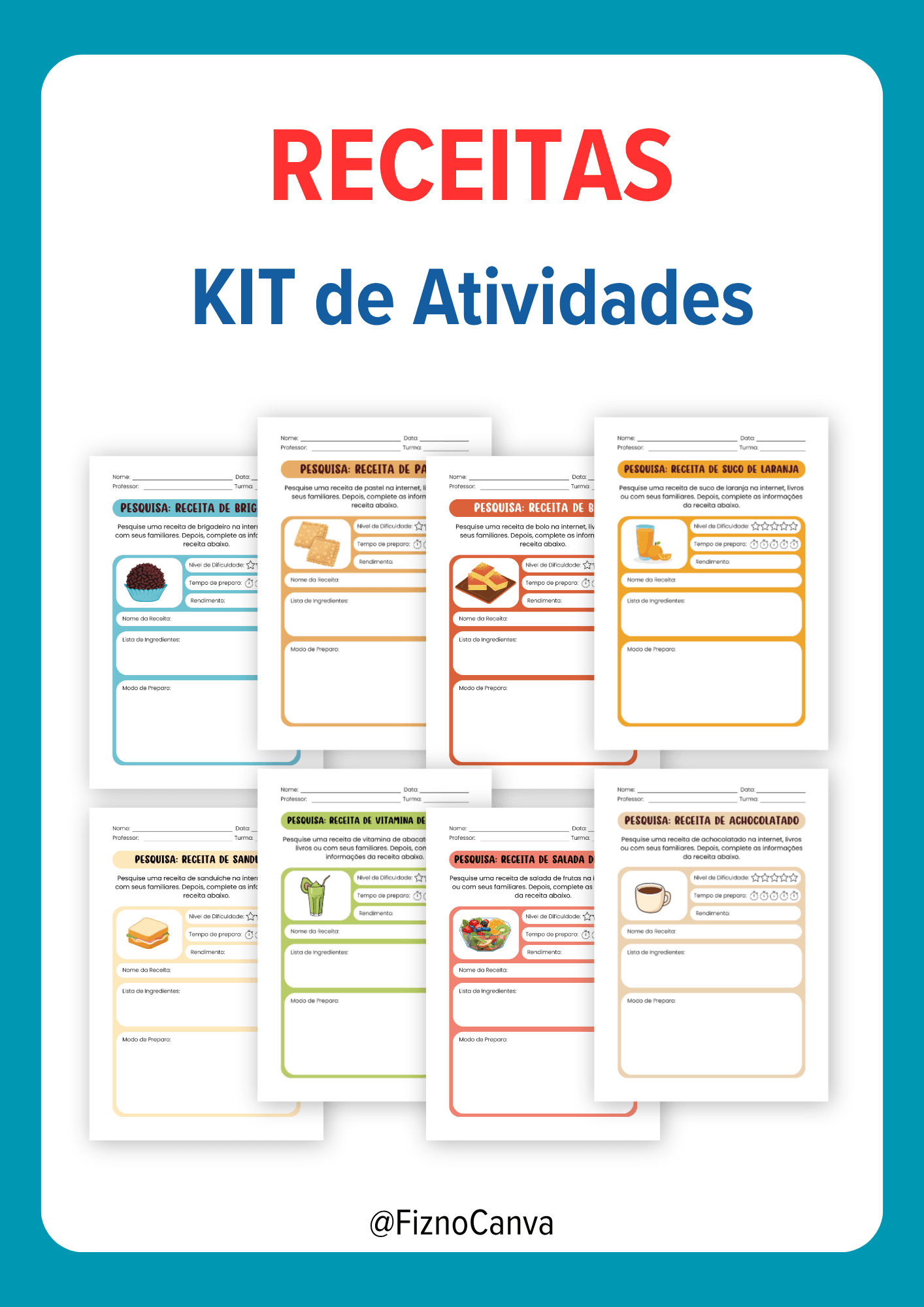 Kit de atividades com receitas simples para alunos do ensino fundamental. Trabalha leitura, escrita e organização de textos instrucionais com receitas como brigadeiro, bolo, suco e salada de frutas.