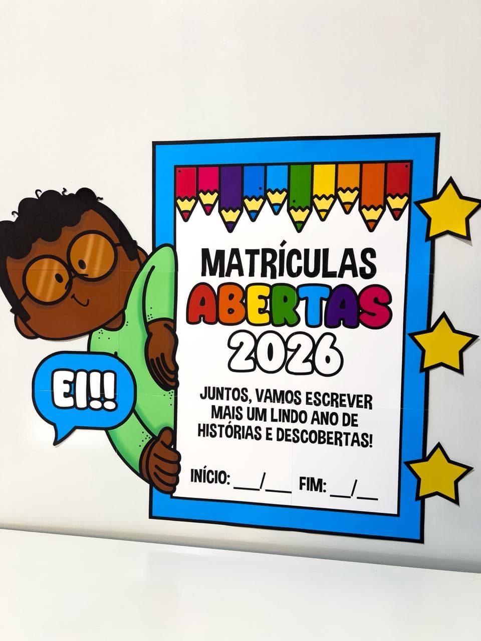 Este painel de matrículas 2026 é composto por 9 folhas no tamanho A4, ideal para destacar o período de matriculas e rematrículas de forma alegre e acolhedora