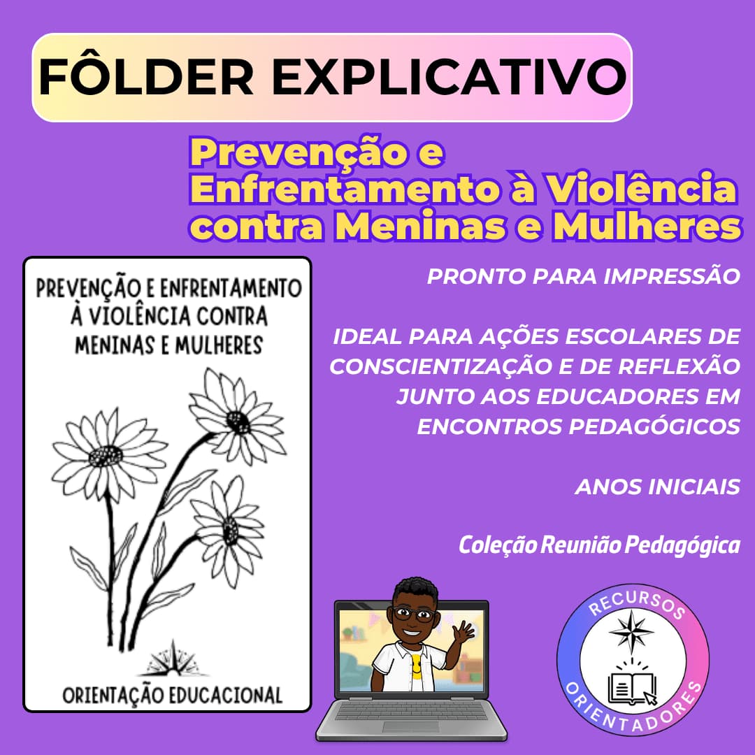 💜🪻 Prevenção e Enfrentamento à Violência Contra Meninas e Mulheres Prepare suas ações para o Agosto Lilás e para todo o ano letivo com este fôlder informativo prático e essencial. O material é uma ferramenta fundamental para a orientação educacional em reuniões pedagógicas e no diálogo com a comunidade escolar. 💜Com este recurso, você terá em mãos: Orientações claras sobre como agir em relatos de violência. Estratégias diretas para combater o machismo, o racismo e o capacitismo na escola. Sugestões de atividades práticas para os anos iniciais. 💜Adquira agora e tenha um guia de consulta rápida para construir um ambiente escolar mais seguro e igualitário.