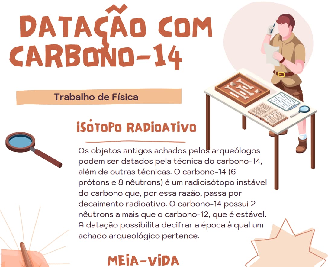 Atividade impressa sobre a técnica de datação com carbono-14, com leitura, cálculo e pesquisa orientada para o Ensino Médio.