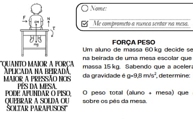 Atividade prática de Física sobre gravidade, força normal e resistência de materiais, contextualizada no hábito dos alunos sentarem na mesa.