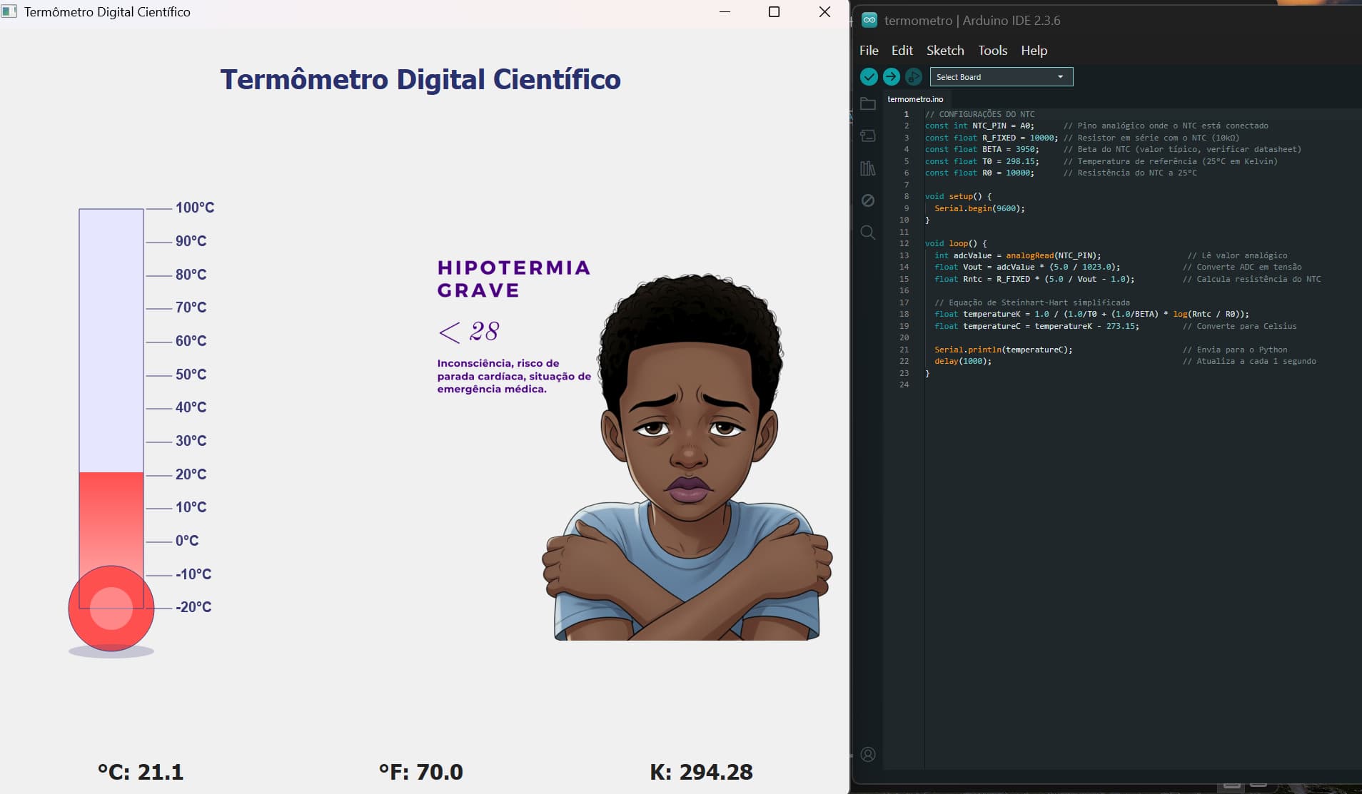 Projeto completo de termômetro digital com Arduino, sensor NTC e interface gráfica em Python, ideal para ensino e experimentação científica.