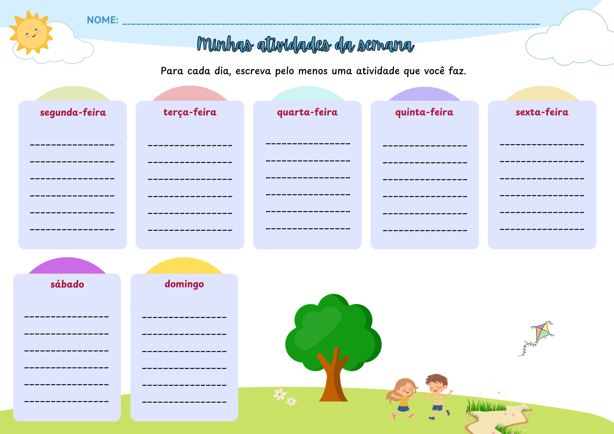 Um recurso incrível para ajudar a criança a reviver suas férias e compartilhar experiências com os amigos! Ela poderá detalhar lugares, companhias, meios de transporte, clima e momentos marcantes, etc.