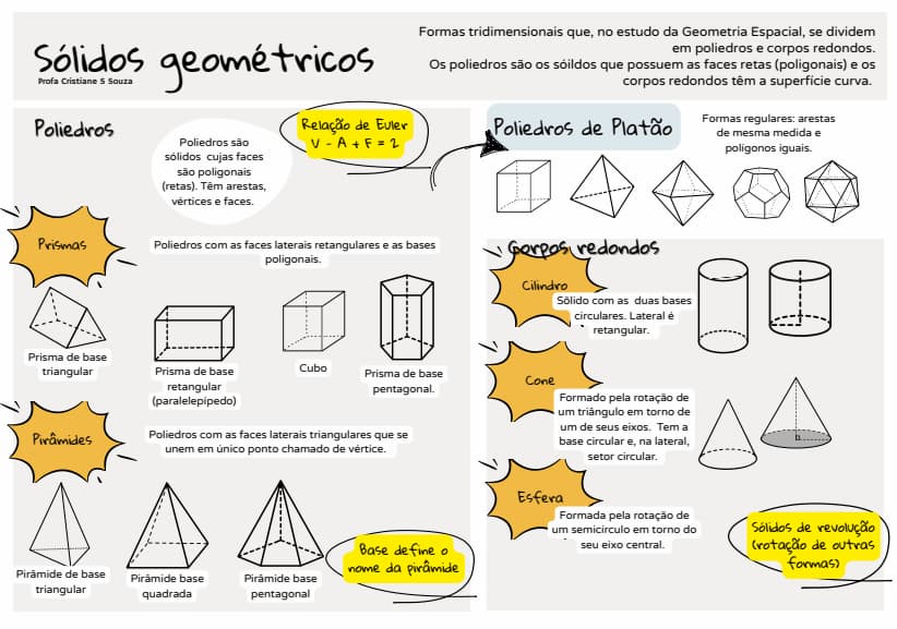 Ficha resumo sobre sólidos geométricos: conceitos, classificações, cálculo de área e volume. Ideal para estudante consultar e estudar.