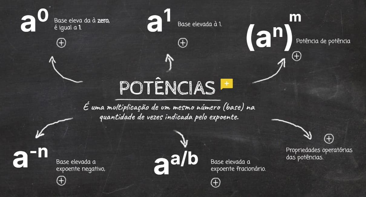 Mapa mental interativo sobre Potência e propriedades, útil para professores e estudantes em introdução, revisão ou estudo autônomo.