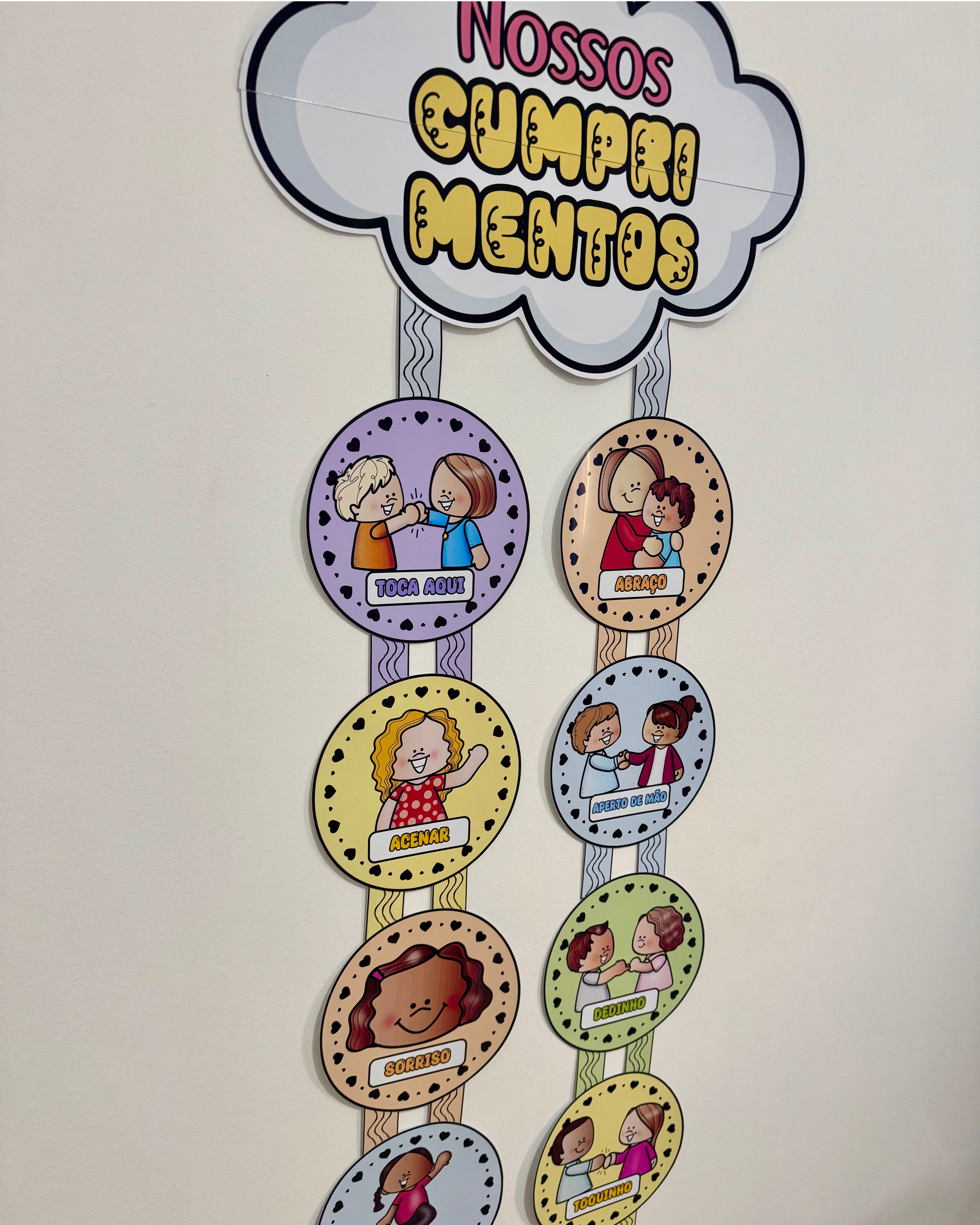 Mural “Nossos Cumprimentos” ideal para turmas de Educação Infantil e séries iniciais do Ensino Fundamental. O arquivo vai com 10 cards ilustrados de cumprimentos diferentes.