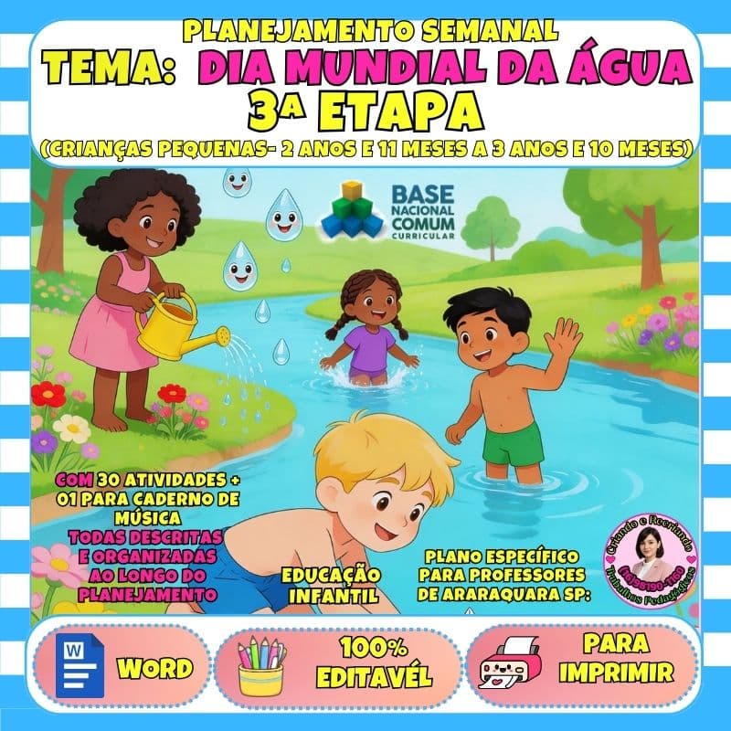 Planejamento semanal completo para 4ª Etapa da Educação Infantil (3 anos e 11 meses a 4 anos e 11 meses) com atividades alinhadas à BNCC sobre água, natureza e sustentabilidade. Arquivo Word totalmente editável.