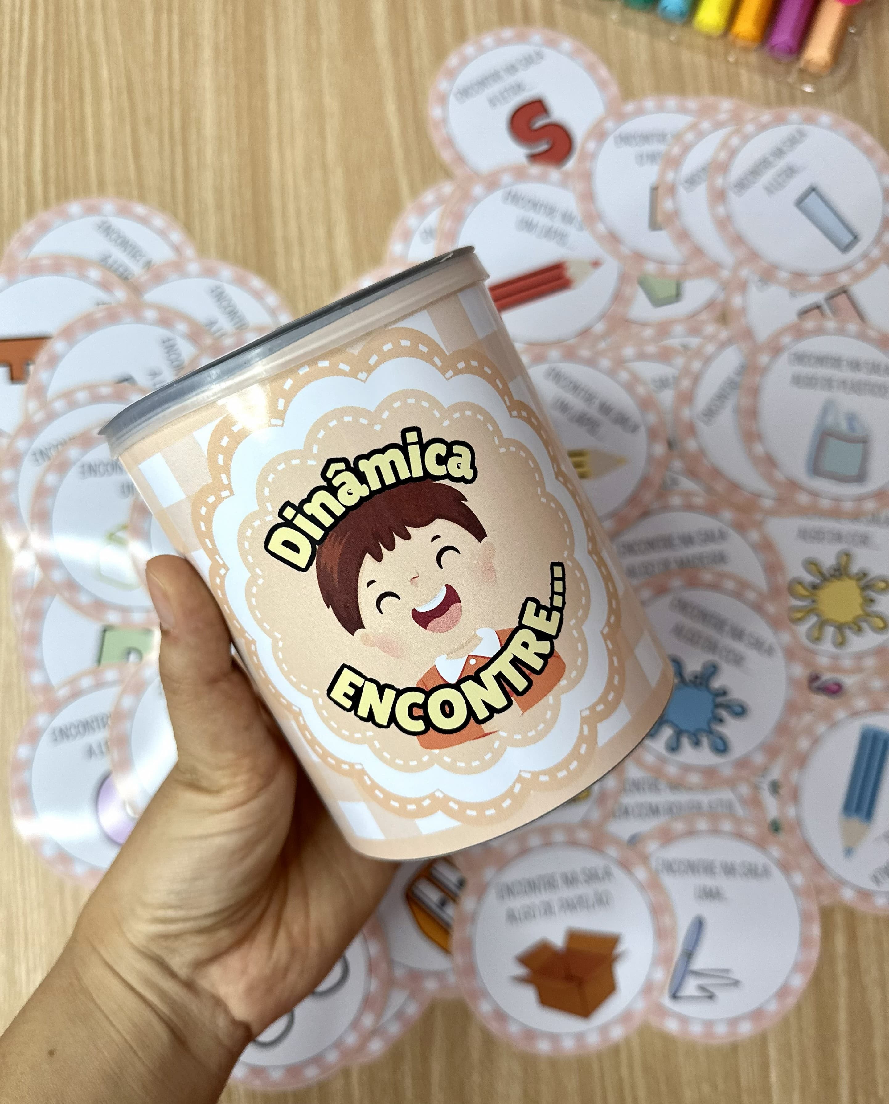 O arquivo Dinâmica "Encontre" inclui 72 fichas e a decoração de lata para a realização da brincadeira.