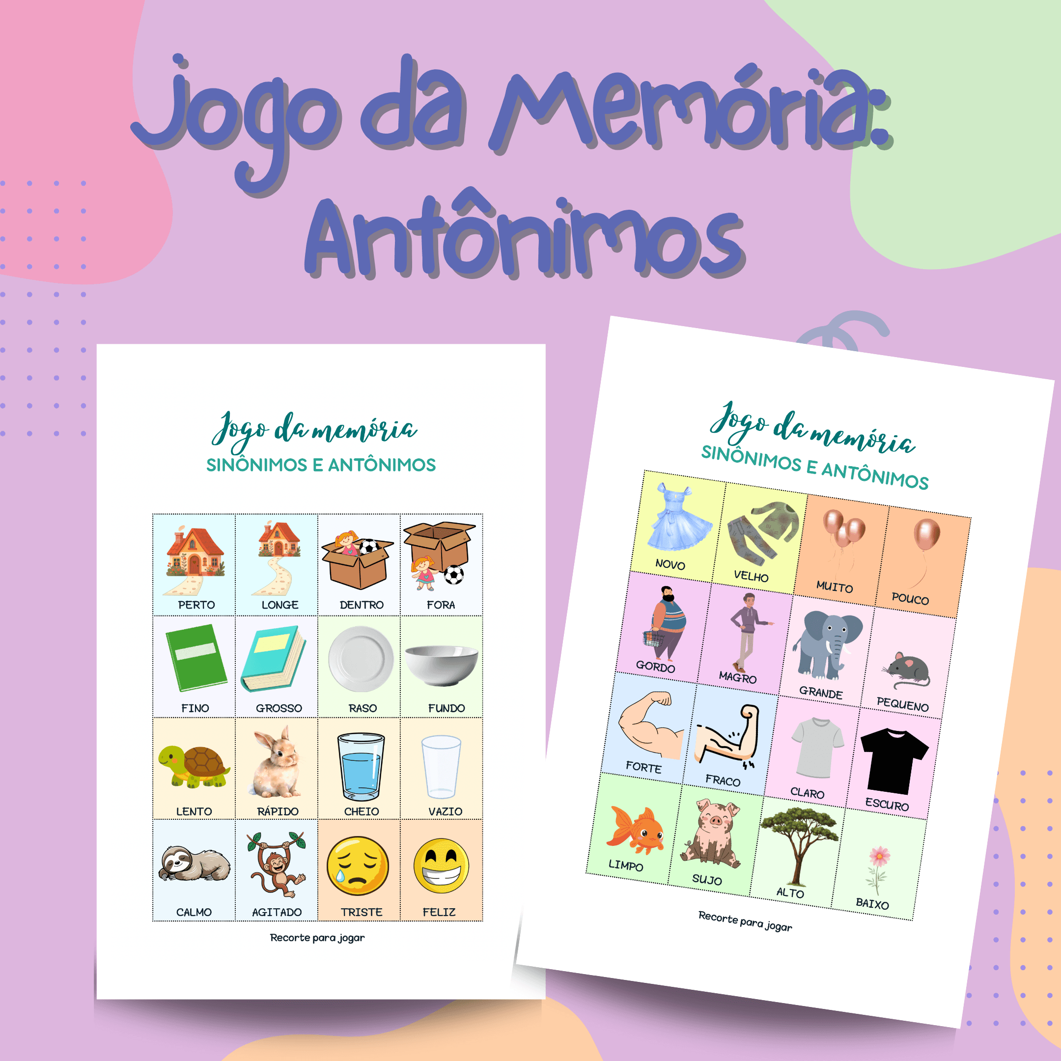 Material gratuito para professores! Jogo da memória de antônimos: imprima, recorte, jogue e ensine vocabulário de forma divertida. Baixe agora! 📚🎲