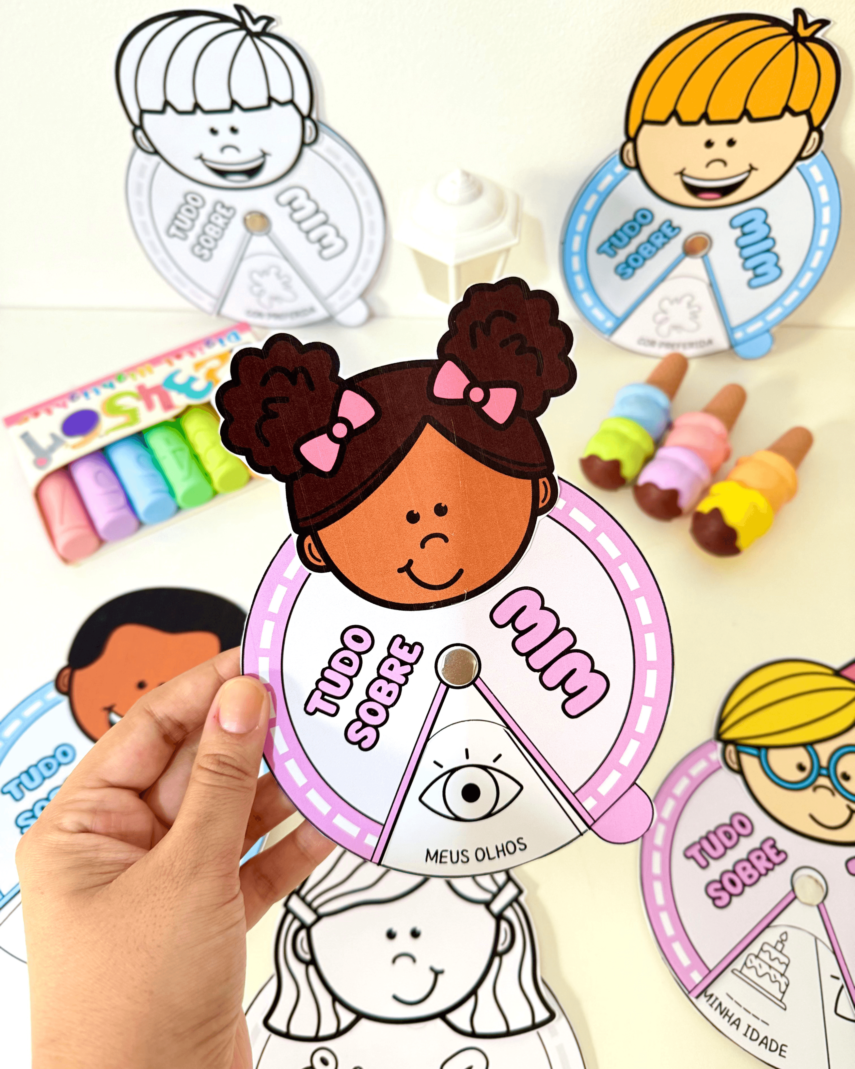Roleta Tudo sobre mim para trabalhar identidade e respeito às diferenças. O material vai na opções colorido e para colorir, com diferentes modelos de crianças para tornar a proposta ainda mais significativa